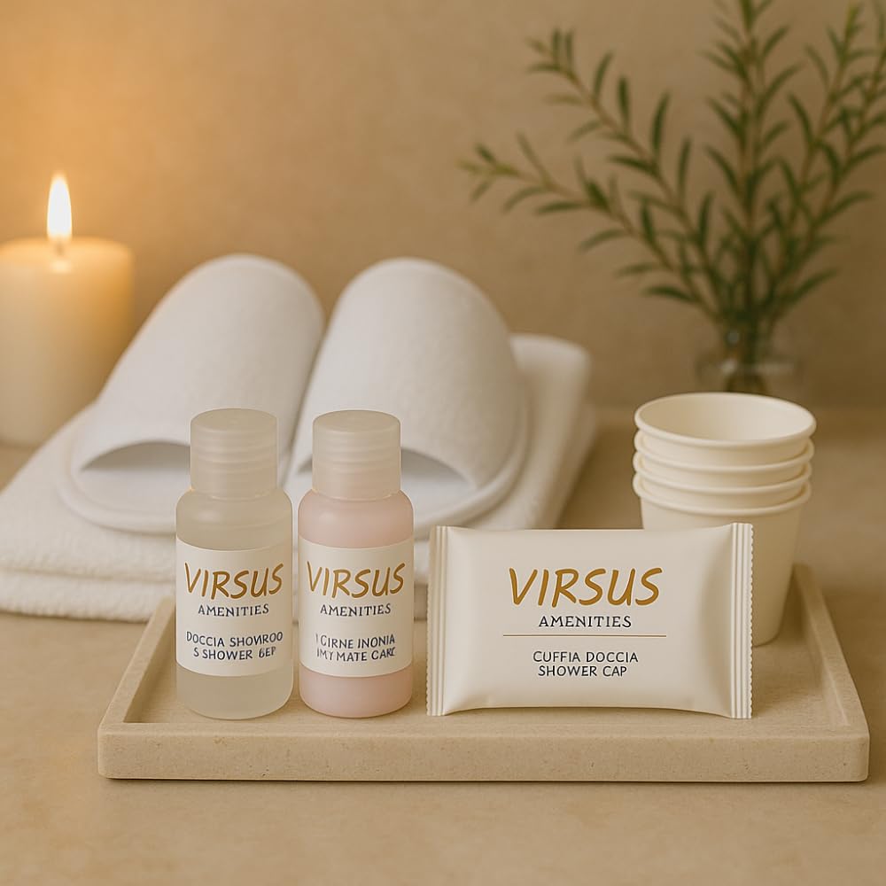 Kit Cortesia GOLD. Ogni Kit comprende 220 prodotti: 50 Flaconi per igiene intima 20ml, 50 Flaconi di doccia shampoo 20ml, 50 cuffie monouso, 50 bicchieri in carta Imbustati, 20 paia di pantofole aperte