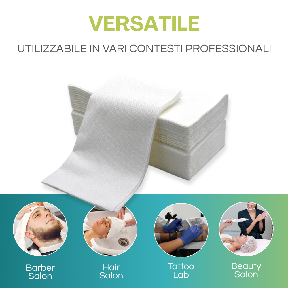 Gli asciugamani monouso di carta in pura cellulosa sono l'alternativa ideale alle asciugamani in tessuto in quanto risultano comode, pratiche e molto igieniche. Sono comunemente utilizzate dai barbieri, parrucchieri, estetiste e spa.