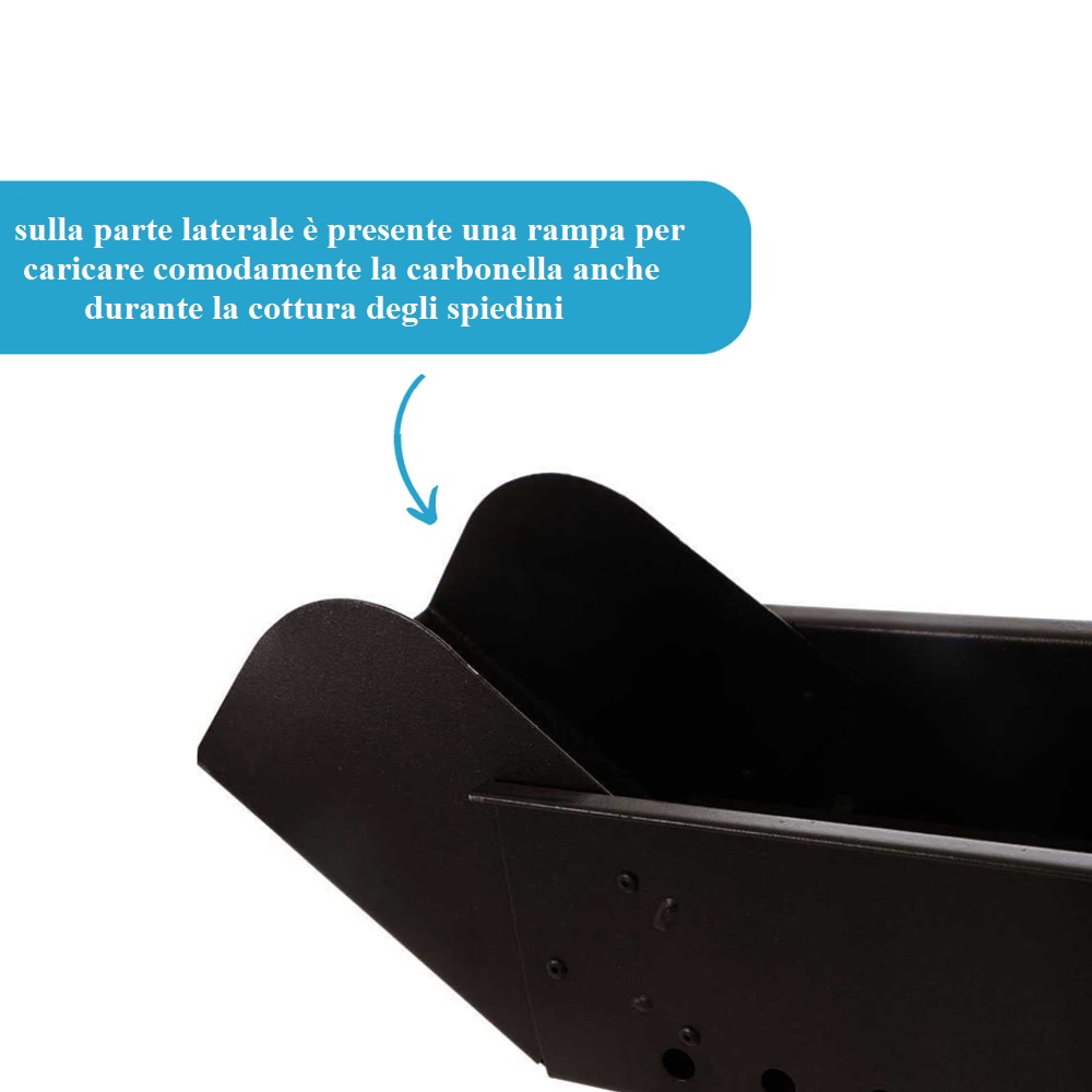 Questa fornacella non è solo perfetta per gli arrosticini, ma è anche ideale per cucinare una varietà di altri alimenti come salsicce, spiedini di pesce, pollo, tacchino, fegato, verdure, Souvlaki e Kebab. Sulla parte laterale è presente una rampa per caricare comodamente la carbonella anche durante la cottura degli spiedini.