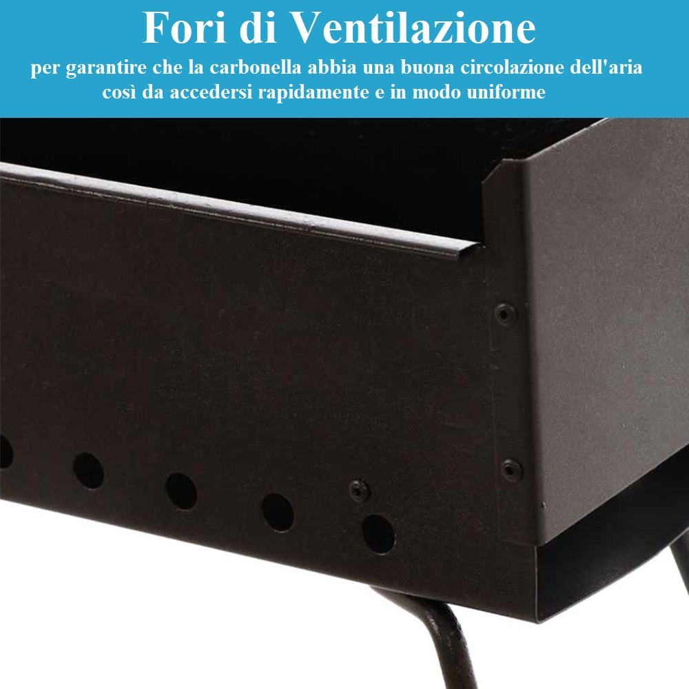 - FORI DI VENTILAZIONE - lungo entrambi i lati della canaletta sono presenti appositi fori per garantire che la carbonella abbia una buona circolazione dell'aria così da accedersi rapidamente e in modo uniforme. I fori permettono una veloce ed omogenea cottura degli alimenti così da soddisfare ogni tua esigenza.