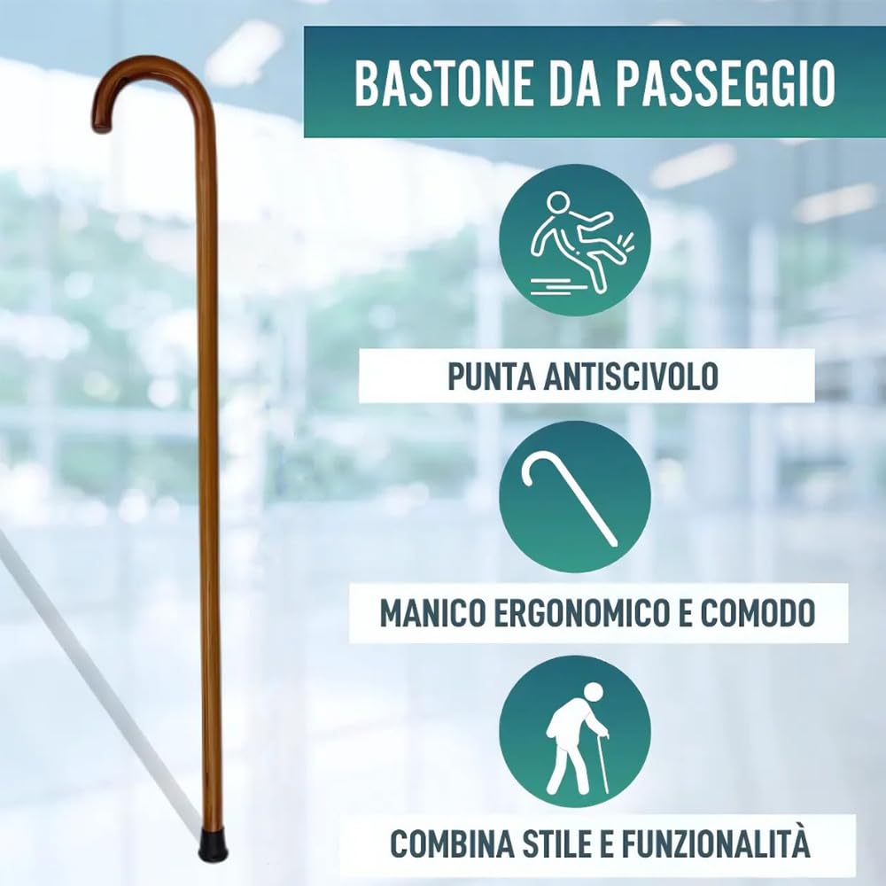 Il Bastone da passeggio per anziani in legno è un accessorio essenziale per chi cerca supporto e stabilità durante le passeggiate. Realizzato in legno di alta qualità, questo bastone dalla lunghezza di 90 cm, ideale per adattarsi alla maggior parte delle esigenze di altezza. Il suo colore marrone dona un aspetto classico ed elegante, perfetto per ogni occasione. L'impugnatura ergonomica è progettata per garantire una presa comoda e sicura, riducendo l'affaticamento della mano durante l'uso prolungato. Inoltre, i gommini antiscivolo alla base assicurano una maggiore aderenza su varie superfici, aumentando la sicurezza dell'utente.