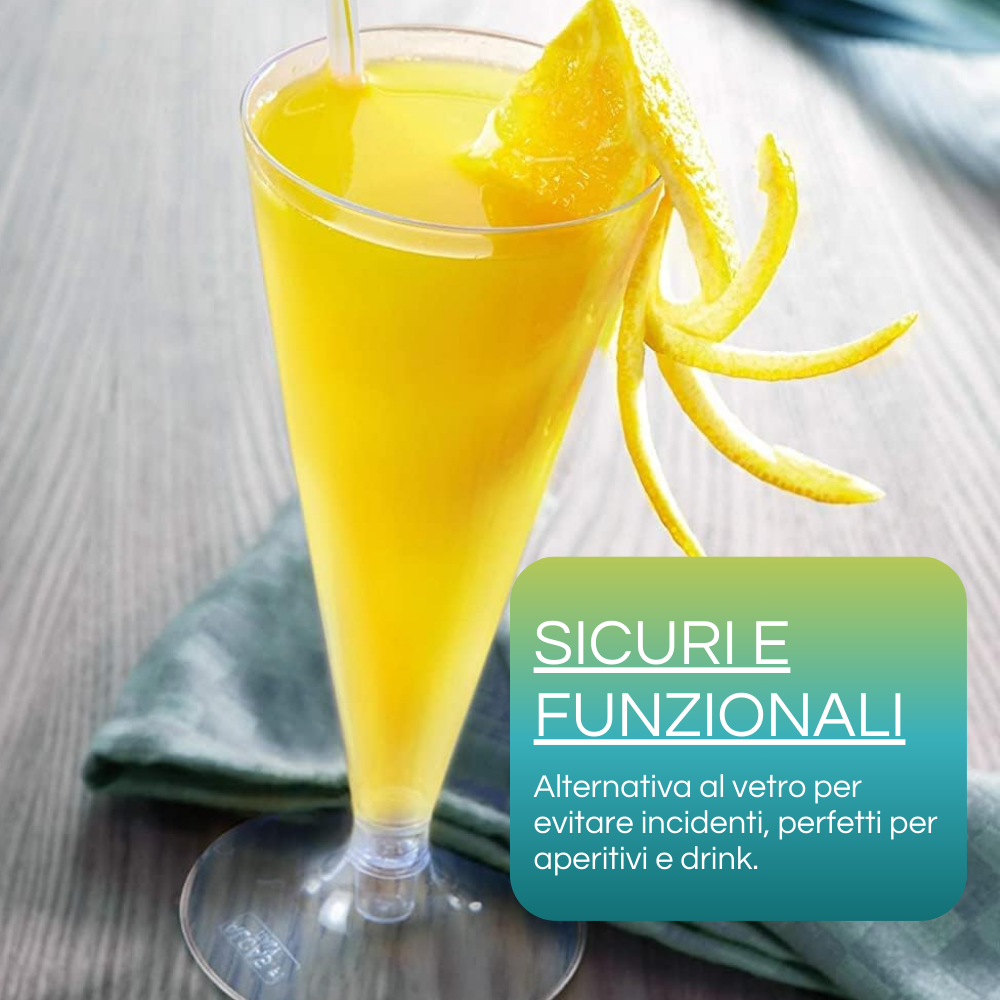 A differenza del classico bicchiere in vetro, con il bicchiere Flute in plastica monouso avrai un guadagno sia economico che di tempo.