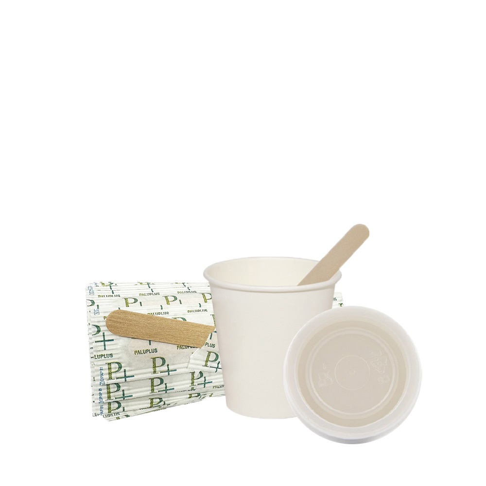 I bicchierini, accoppiati agli appositi coperchi in PS e le palette in legno di betulla, sono realizzati con materiali biodegradabili al 100% salvaguardando l'ambiente.