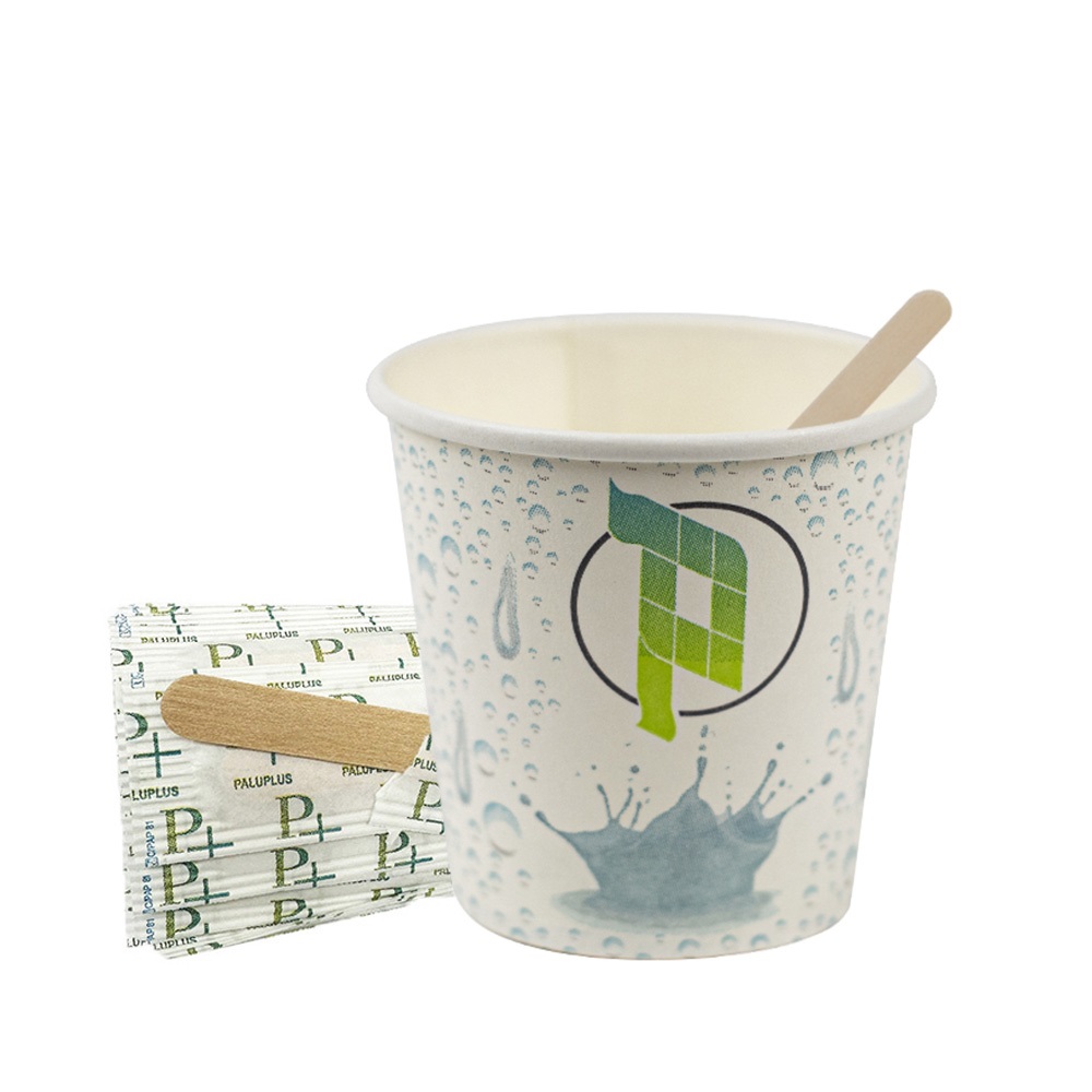 I bicchieri da 180ml in carta di colore bianco con Grafica "Palucart" monouso sono realizzati in cartoncino di pura cellulosa di altissima qualità accoppiato a caldo con un film in PLA, adatti per bevande calde ma anche fredde.