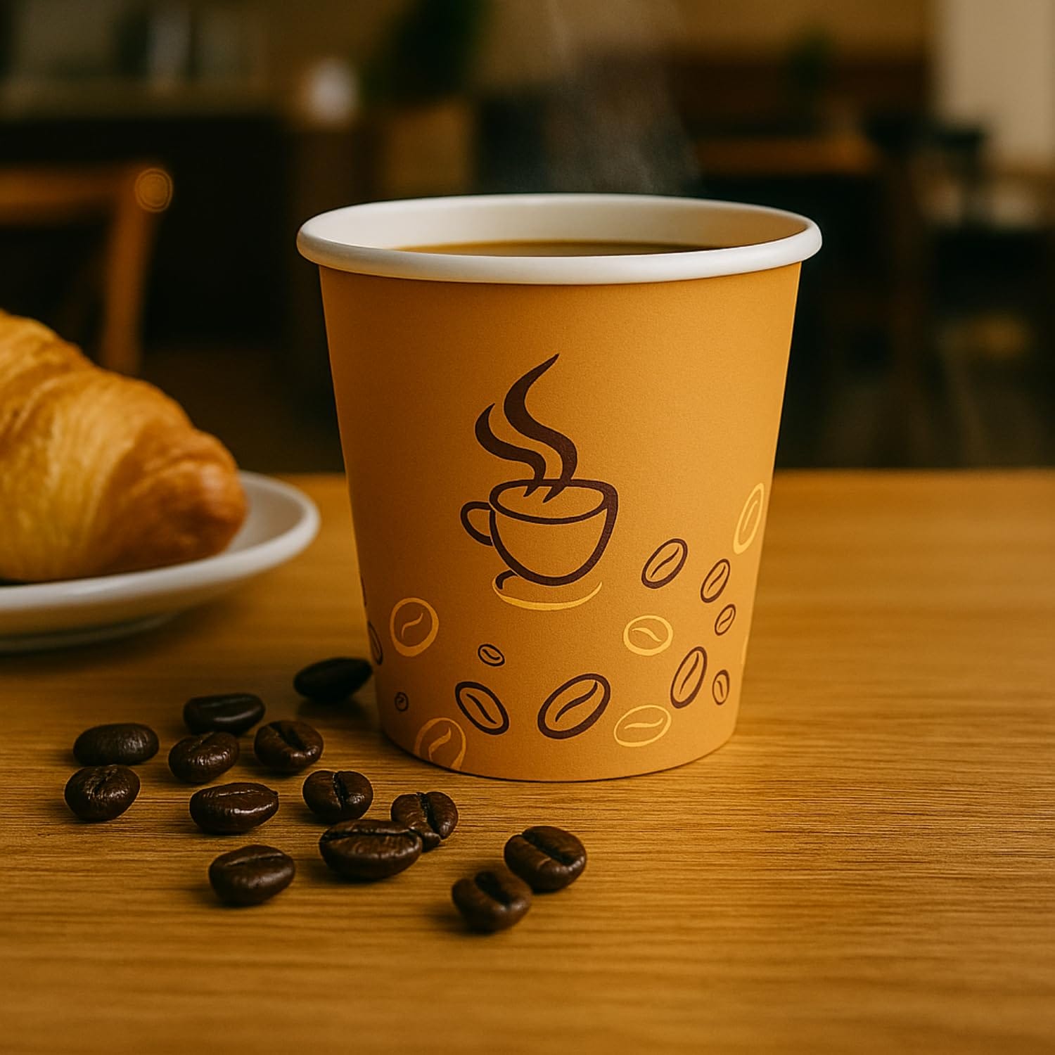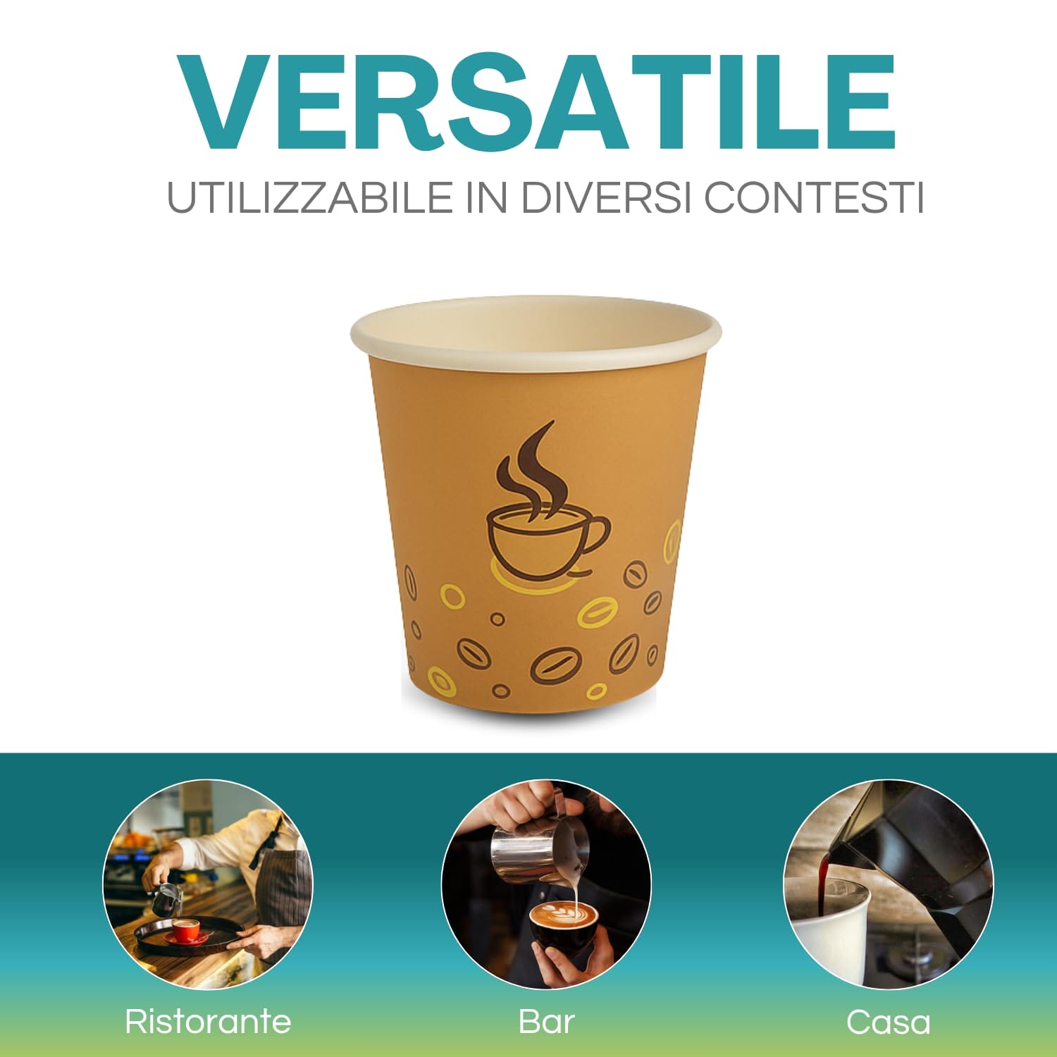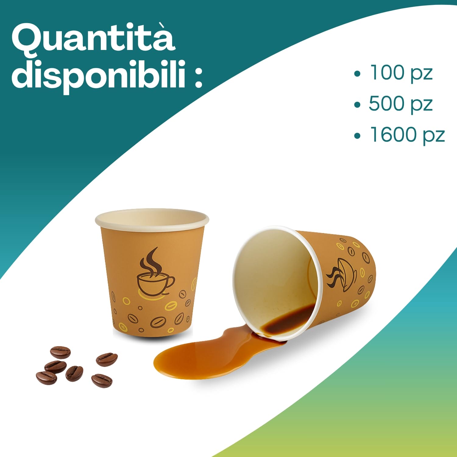bicchieri da 75ml in carta, di colore Avana con Grafica Chicco di Caffè monouso, sono realizzati in cartoncino di pura cellulosa di altissima qualità accoppiato a caldo con un sottile film in PLA, adatti per bevande calde ma anche fredde.