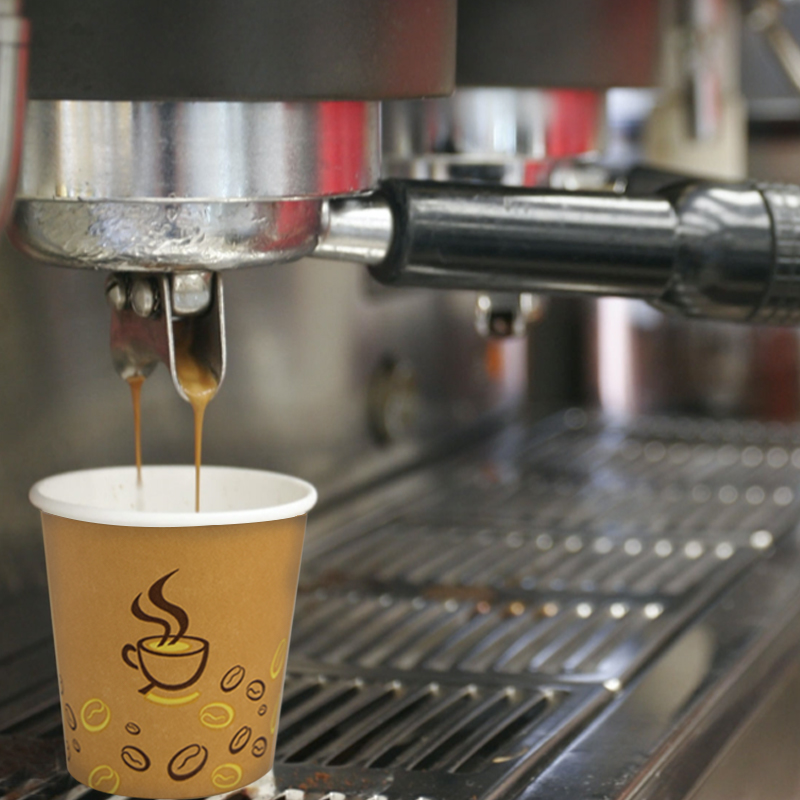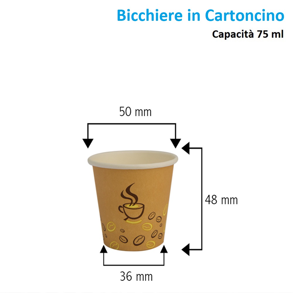 bicchieri da 75ml in carta, di colore Avana con Grafica Chicco di Caffè monouso, sono realizzati in cartoncino di pura cellulosa di altissima qualità accoppiato a caldo con un sottile film in PLA, adatti per bevande calde ma anche fredde.