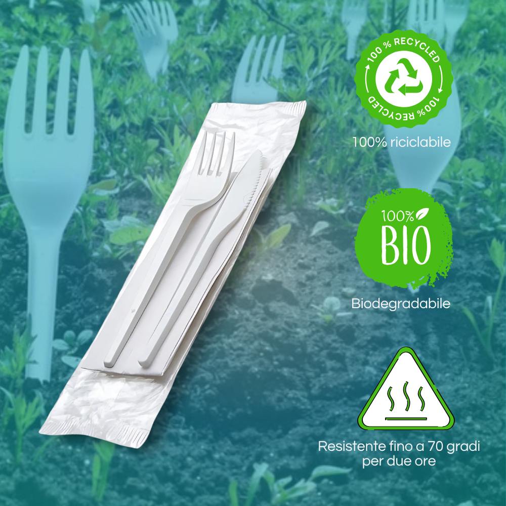 Bis posate monouso in CPLA biodegradabili, imbustati in comode confezioni contenenti
