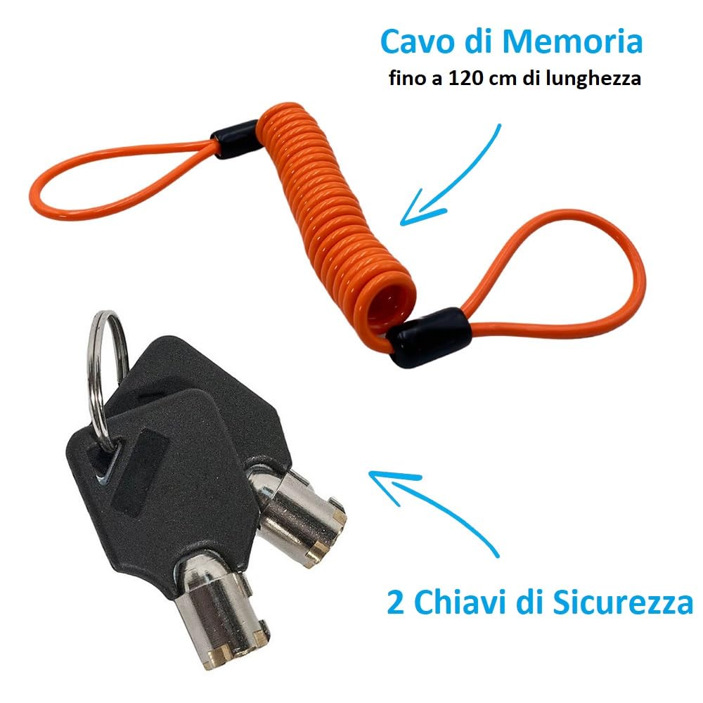 Inoltre, include un cavo di memoria arancione lungo 120 cm che funge da promemoria visivo, aiutandoti a non dimenticare il bloccadisco quando riparti. La praticità è ulteriormente migliorata grazie alla custodia inclusa, che consente un facile trasporto e conservazione.
