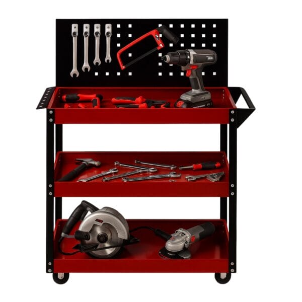 Carrello portautensili professionale a 3 ripiani con pannello forato - mis. 81x35x110 cm - Porta attrezzi in acciaio verniciato rosso e nero ruote girevoli