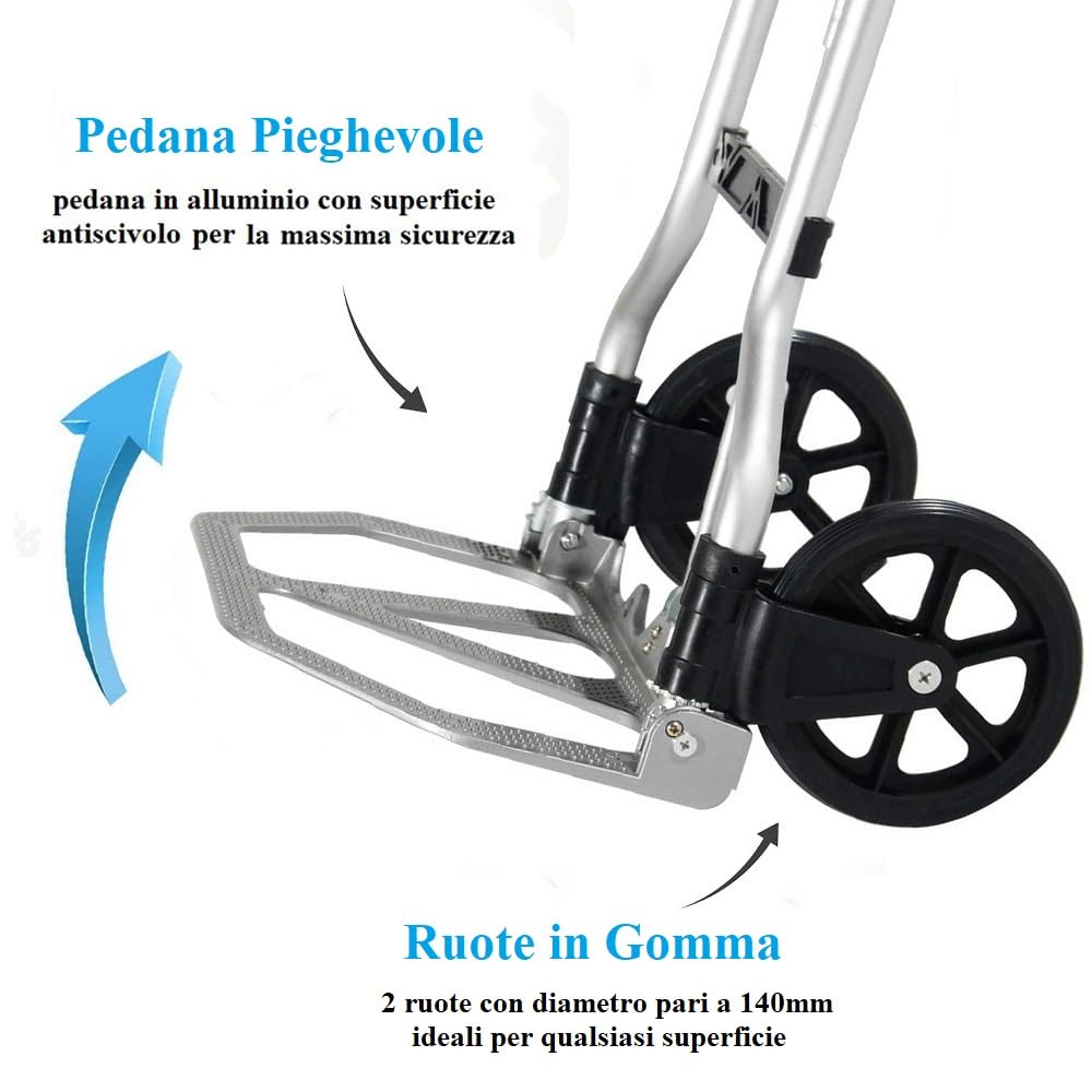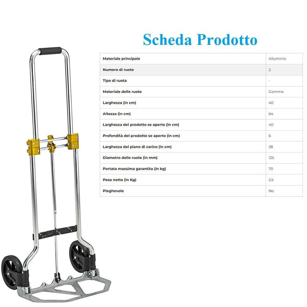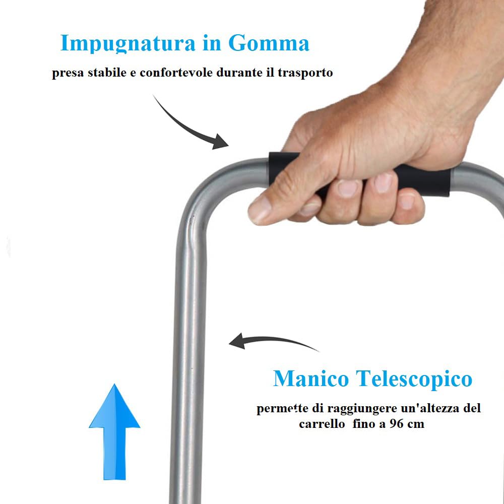 Carrello portapacchi pieghevole in alluminio - Misura 38x34x96 cm e portata massima 45 Kg - Manico telescopico e 2 ruote in gomma, montacarichi manuale per trasporto di carichi pesanti