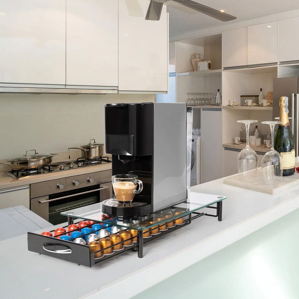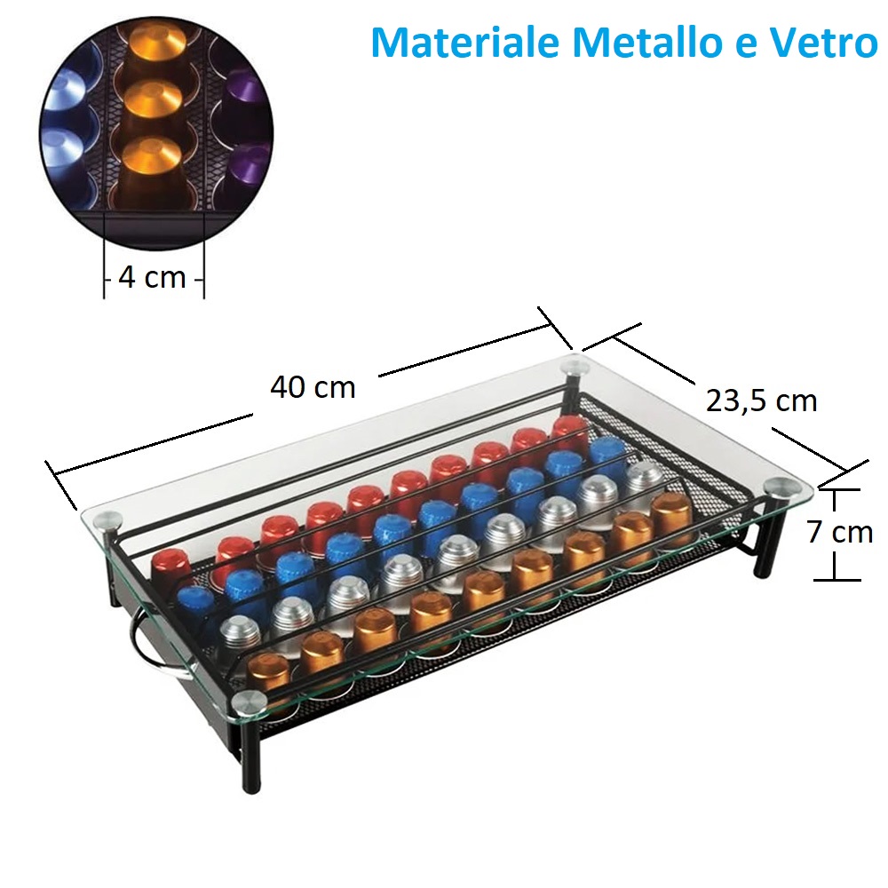 Cassetto portacapsule da 40 capsule, misura 23,5x40x7 cm - Supporto in metallo e vetro per macchina da caffè, piedini antiscivolo e antigraffi, dispenser capsule