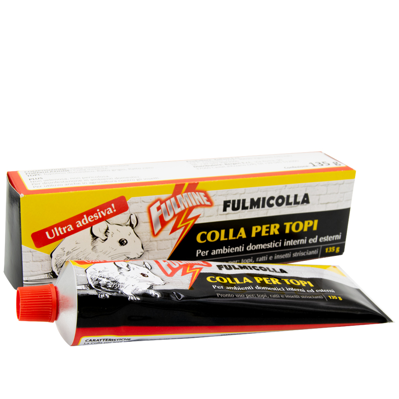 La colla per topi Fulmine costituisce una trappola mortale per topi o insetti. Essa, si presenta inodore e incolore ed è adtta per topilino domestico, ratto grigio, ratto nero, ed insetti vari. Questa colla Ultra adesiva è racchiusa in un pratico tubetto da 135 g ed è pronta all'utilizzo.