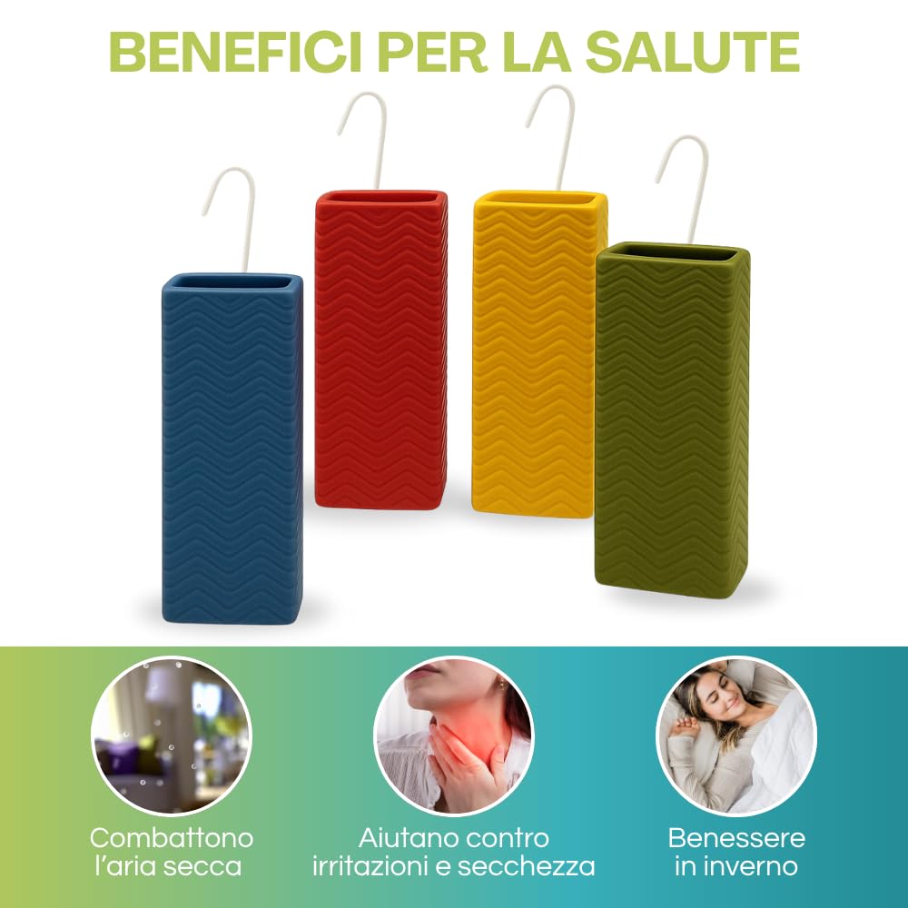 Set 4 Evaporatori d'acqua per termosifoni - mis. 8x4x18cm - Umidificatori termosifone in ceramica con motivo RIGHE A ONDA e gancio a S - Rosso, verde, giallo e blu