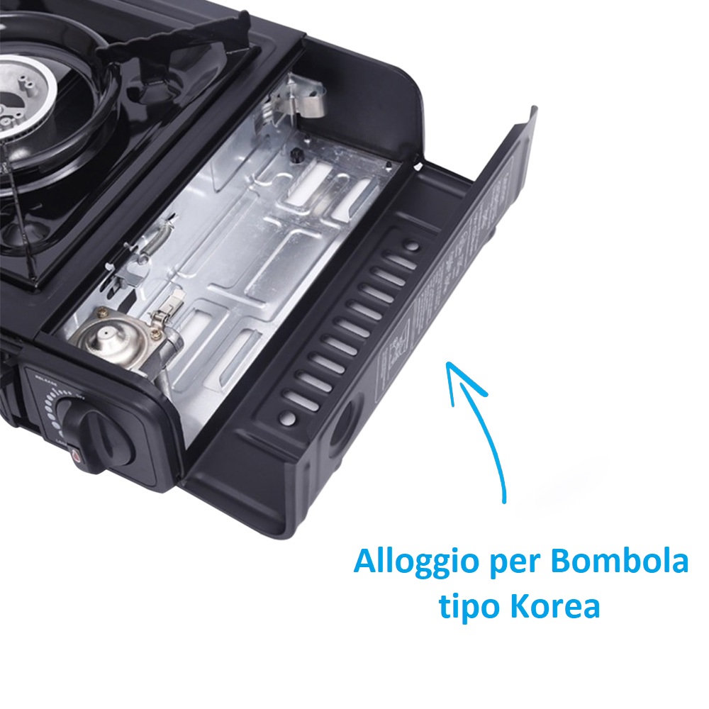 Il prodotto utilizza cartucce di tipo coreano da 250 gr (non incluse in confezione), garantendo un'alimentazione continua ed efficiente. L'alimentazione a gas assicura una combustione pulita e sicura, perfetta per l'uso all'aperto. Le cartucce sono facili da installare e sostituire permettendoti di concentrarti unicamente sulla preparazione dei tuoi pasti.