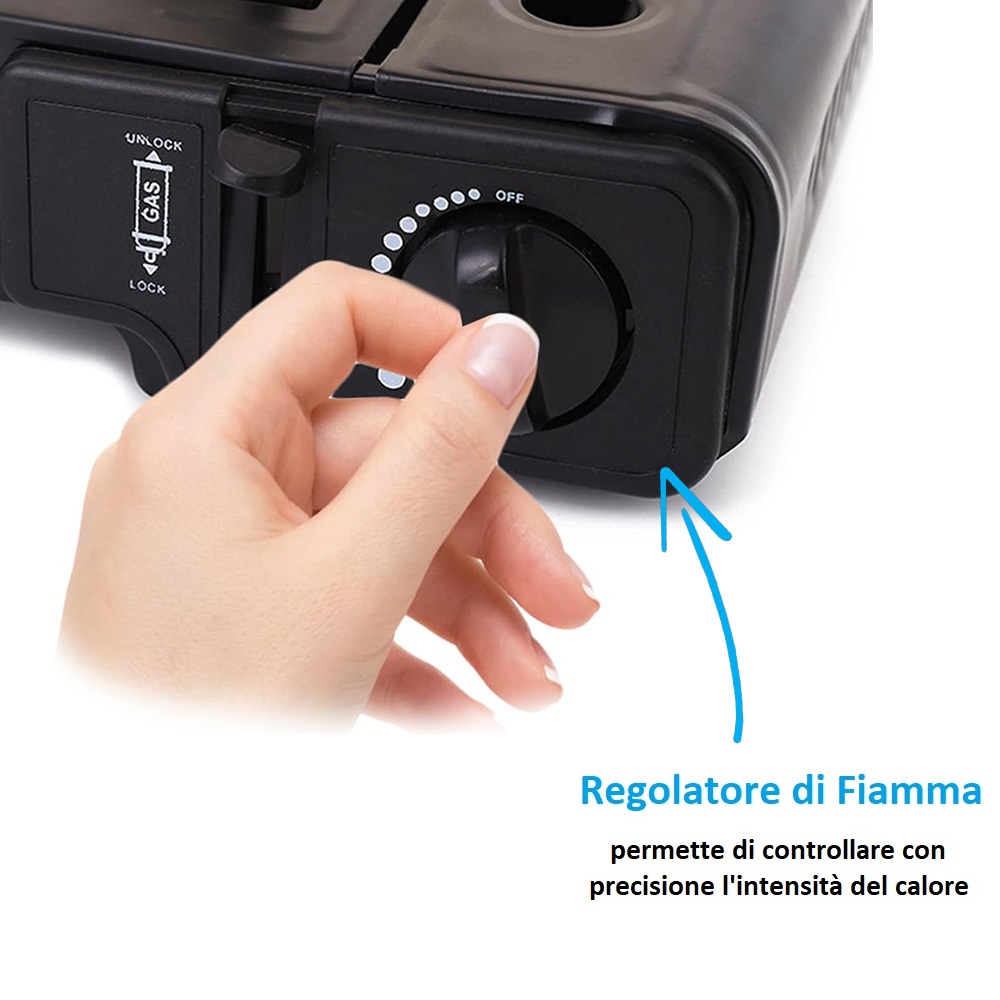 - REGOLATORE DI FIAMMA - dotato di un regolatore di fiamma che permette di controllare con precisione l'intensità del calore per soddisfare ogni tua esigenza. Con un design compatto e un peso ridotto, questo fornellino è facile da trasportare rendendolo un compagno ideale per i tuoi viaggi.