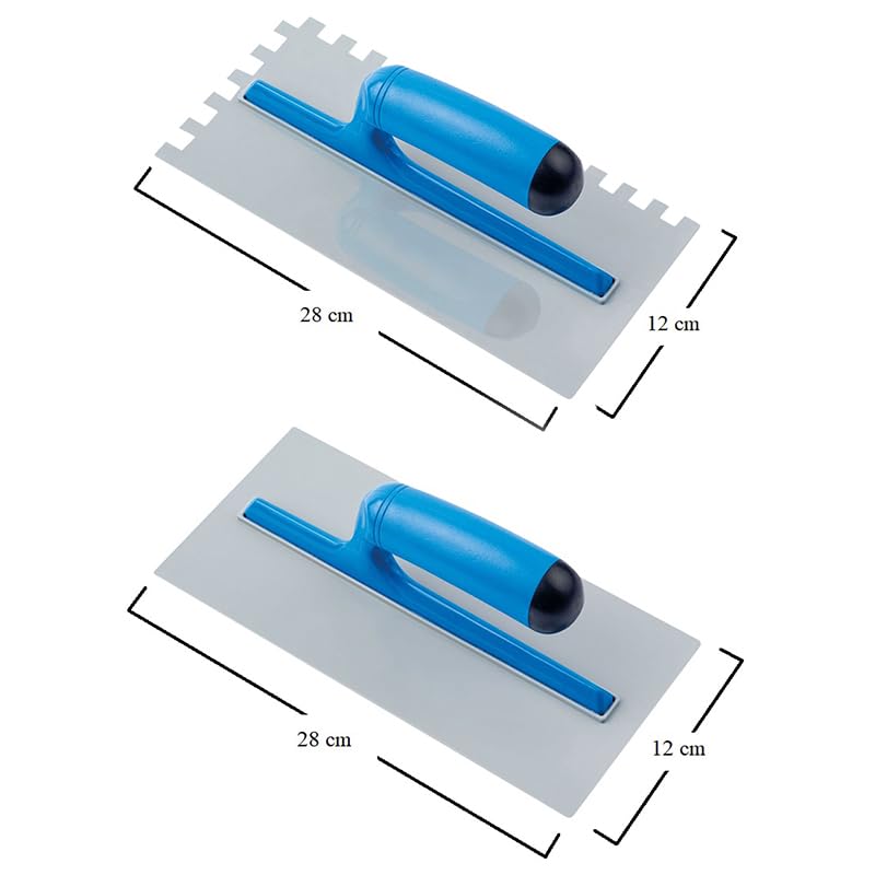 Kit 4 utensili per muratore con lame in acciaio: 1 cazzuola da 18 cm, 1 cazzuolino da 14 cm, 1 frattazzo per stucco e 1 frattazzo dentato per colla da 28x12cm