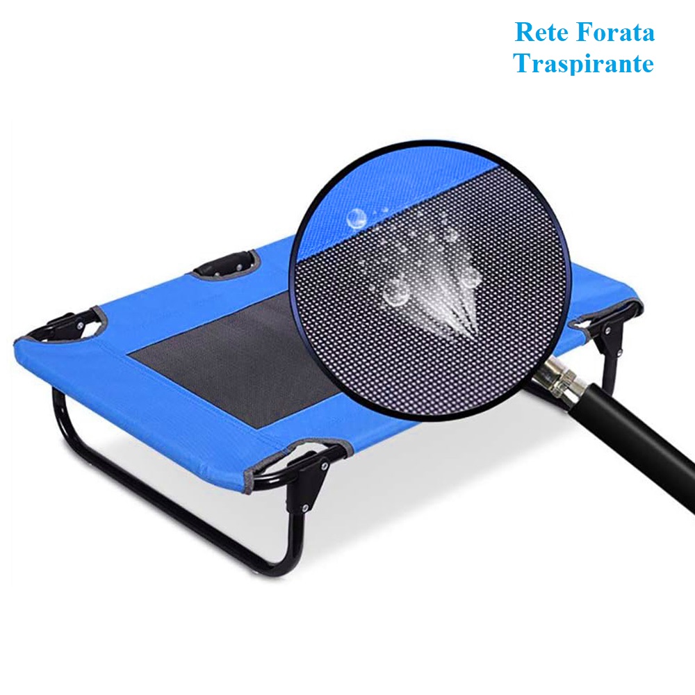 Un lettino pieghevole con dimensioni 75x52x17 cm con struttura in metallo per far riposare il tuo amico a quattro zampe lontano dall'umidità e dalla polvere del terreno e per favorire il ricircolo dell'aria.
