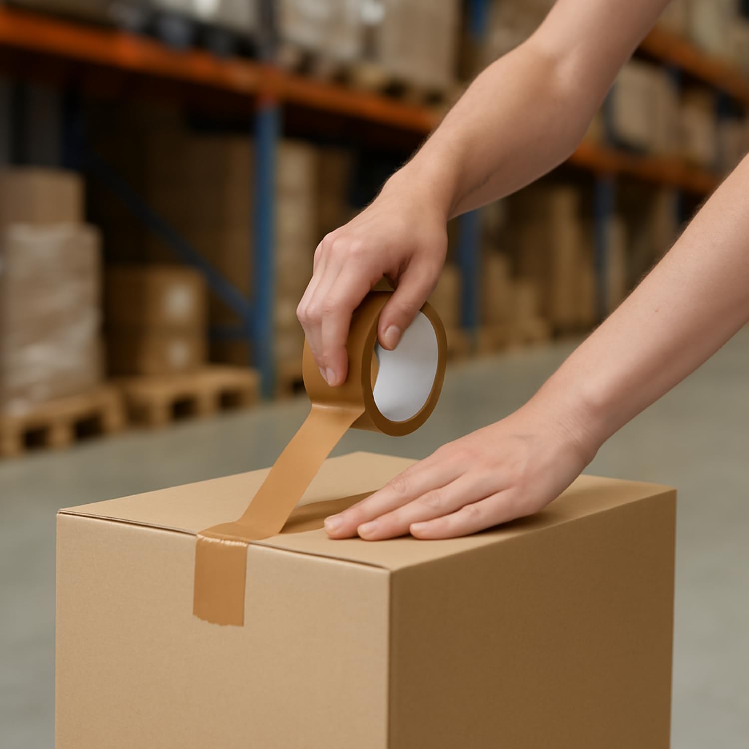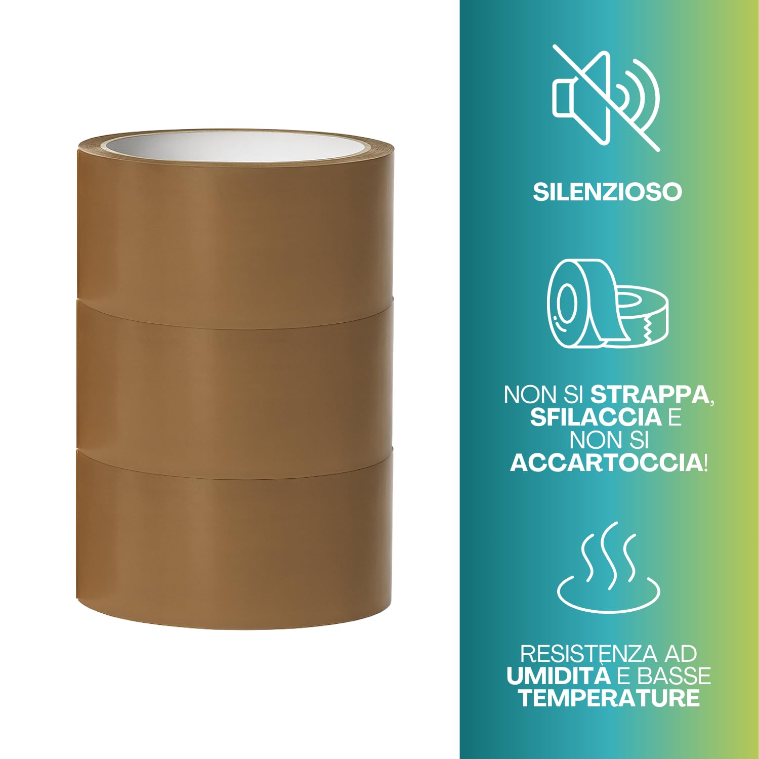 Il nastro adesivo silenzioso in polipropilene, di colore Avana, con spessore 28 Micron, é progettato per imballaggio manuale.