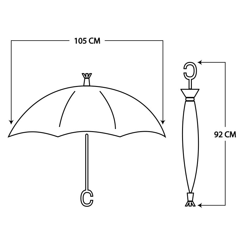 L'ombrello presenta un manico a forma di "C" che a differenza del classico manico a "J", ti permette di utilizzare le braccia al posto delle mani. Questa pratica innovazione lo rende estremamente pratico lasciandoti le mani libere per usare il telefono, portare borse o tenere in braccio il tuo bambino.