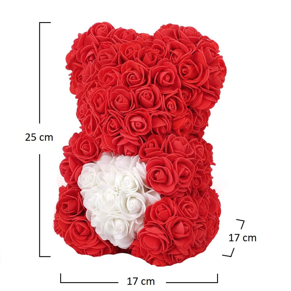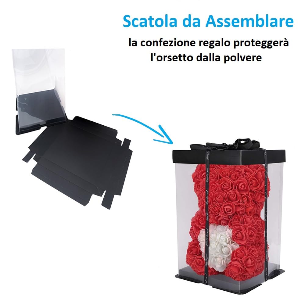 L'orso, con una misura pari a 17x17x25 cm, è perfetto da esporre su una mensola o un comodino, aggiungendo un tocco di eleganza a qualsiasi ambiente. Viene fornito con una scatola regalo trasparente da montare, rendendolo pronto per essere regalato senza bisogno di ulteriori confezionamenti. La scatola non solo protegge il tuo dono, ma ne esalta anche la bellezza, permettendo di ammirare ogni dettaglio delle rose.