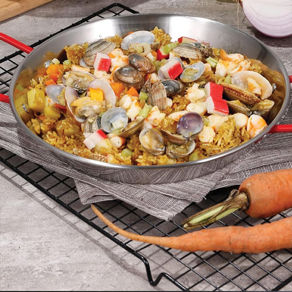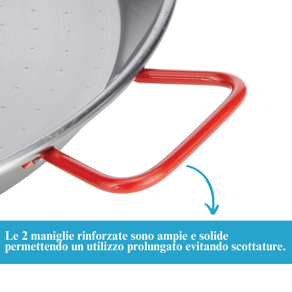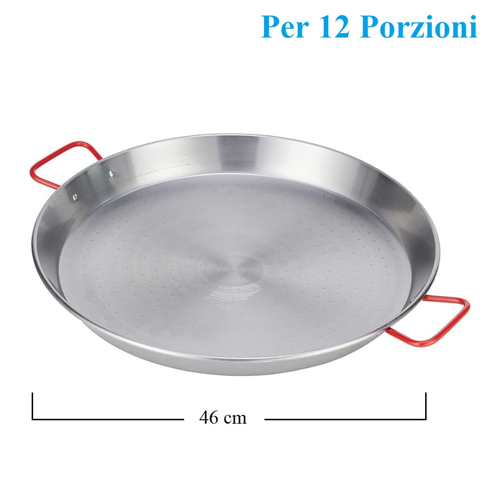 Padella per paella valenciana per 12 Porzioni, diametro 46 cm - Padella in ferro lucido con 2 manici rossi verniciati, per cucinare e servire la paella e carne