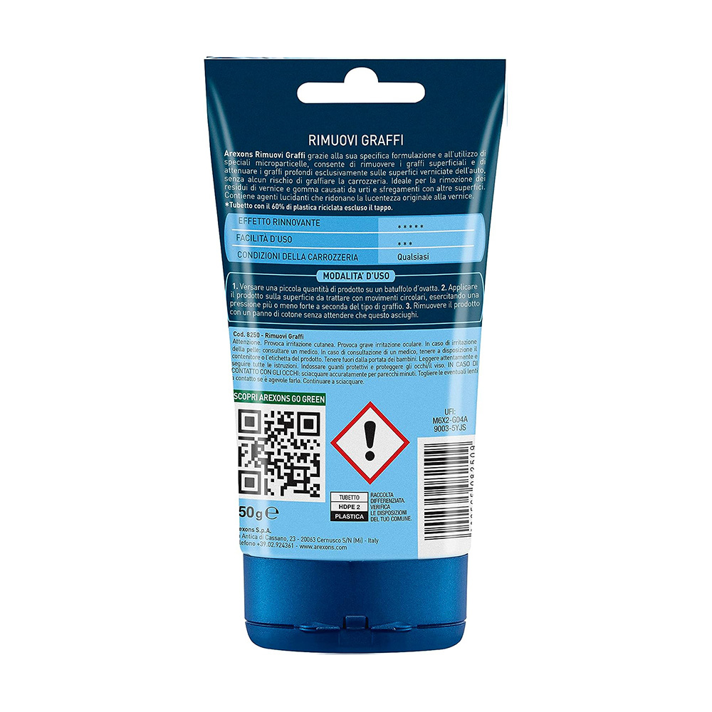 Tubetto di Rimuovi Graffi da 150gr, ideale per la rimozione manuale di graffi superficiali dalla carrozzeria della tua auto o moto in seguito a piccoli urti o sfregamenti. Ideale per la rimozione dei residui di vernice e gomma causati da urti e sfregamenti con altre superfici.