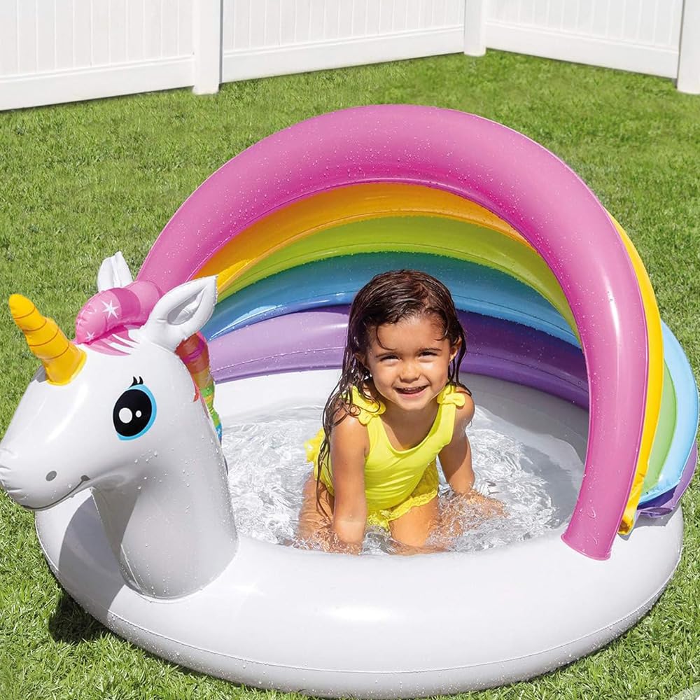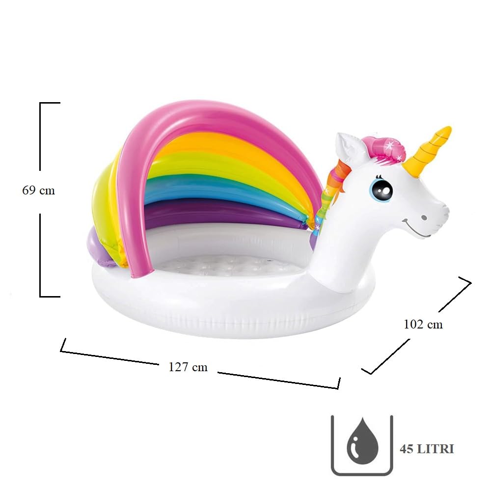Piscina gonfiabile con misura 127x102x69 cm a forma di Unicorno - Piscinetta per bambini in Pvc con parasole arcobaleno