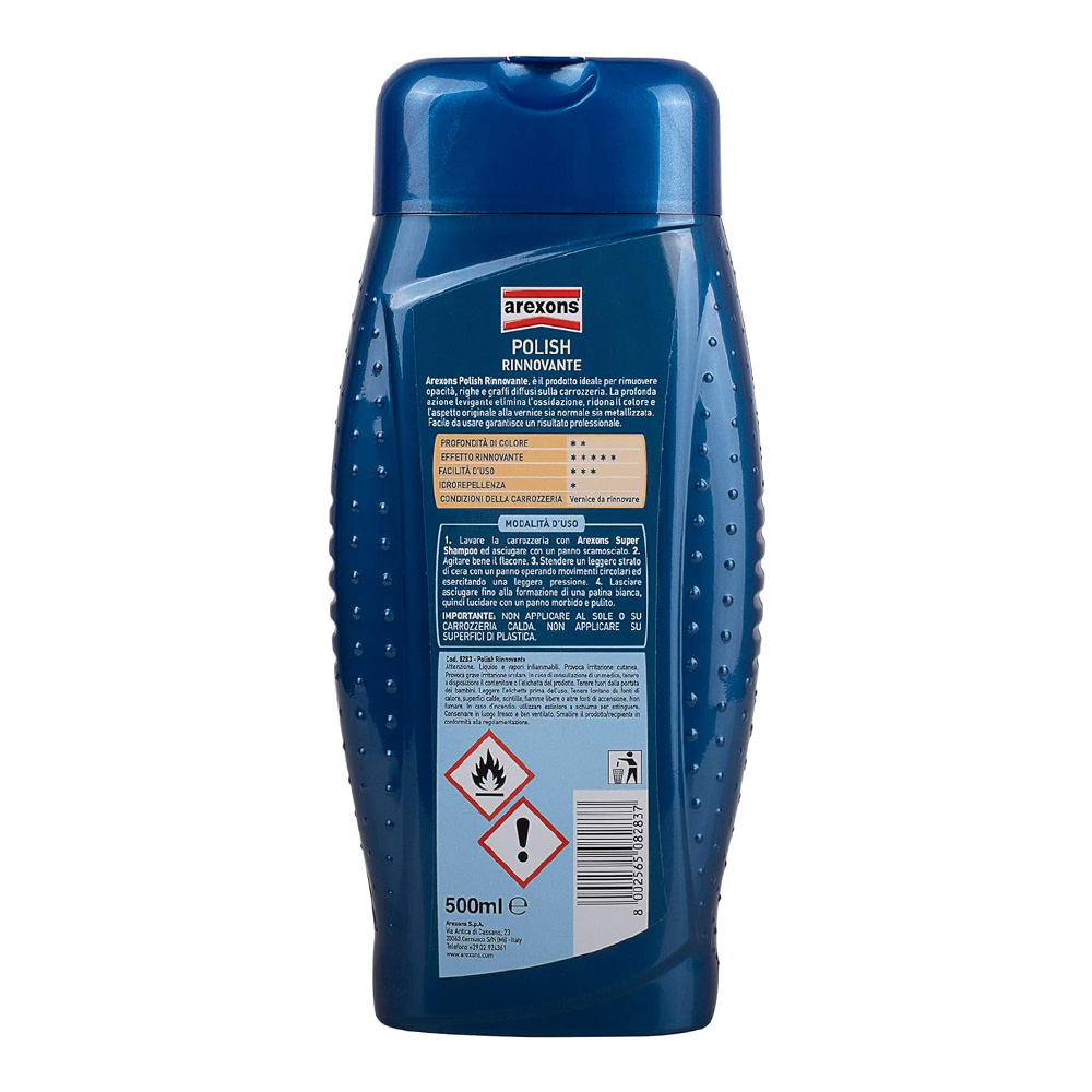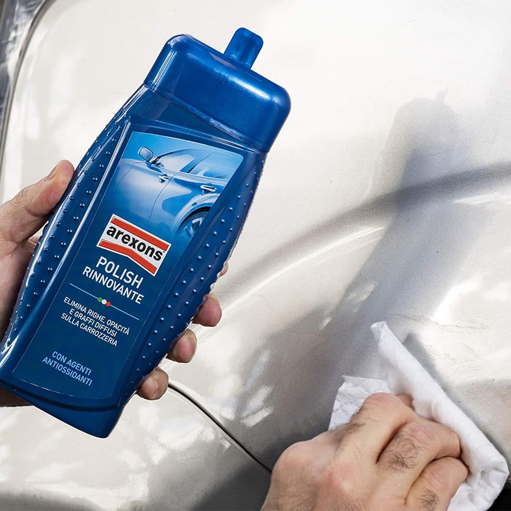 Flacone di Polish Rinnovante da 500ml, ideale per ripristinare la lucentezza della vernice opacizzata conferendo un lucido profondo. Utilizzato per rimuovere opacità, righe e graffi diffusi sulla carrozzeria di automobili ormai non più nuove e con vernici fortemente invecchiate o rovinate.