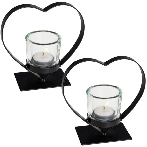 Set da 2 portacandele a forma di cuore, misura 15x6x15 cm, struttura in metallo nero con bicchiere in vetro per candela tea-light