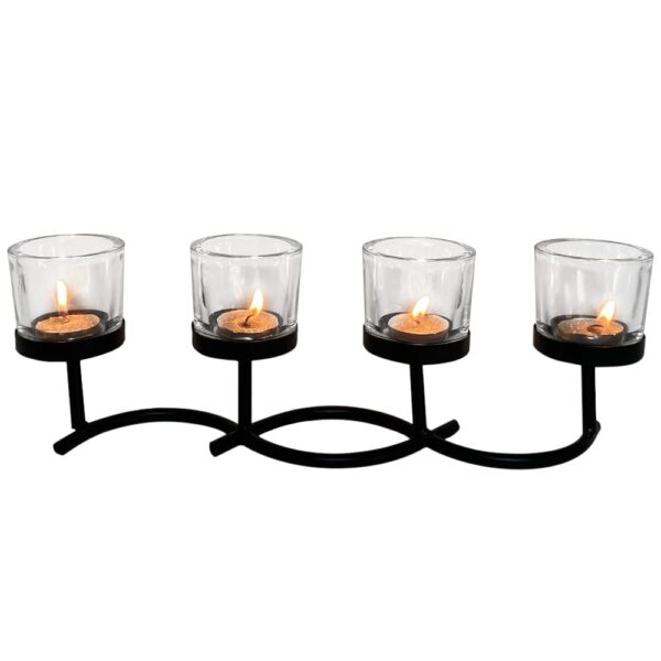Portacandele a 4 bicchieri, misura 36x7,5x12 cm, struttura in metallo nero con bicchieri in vetro spesso per candele e tealight