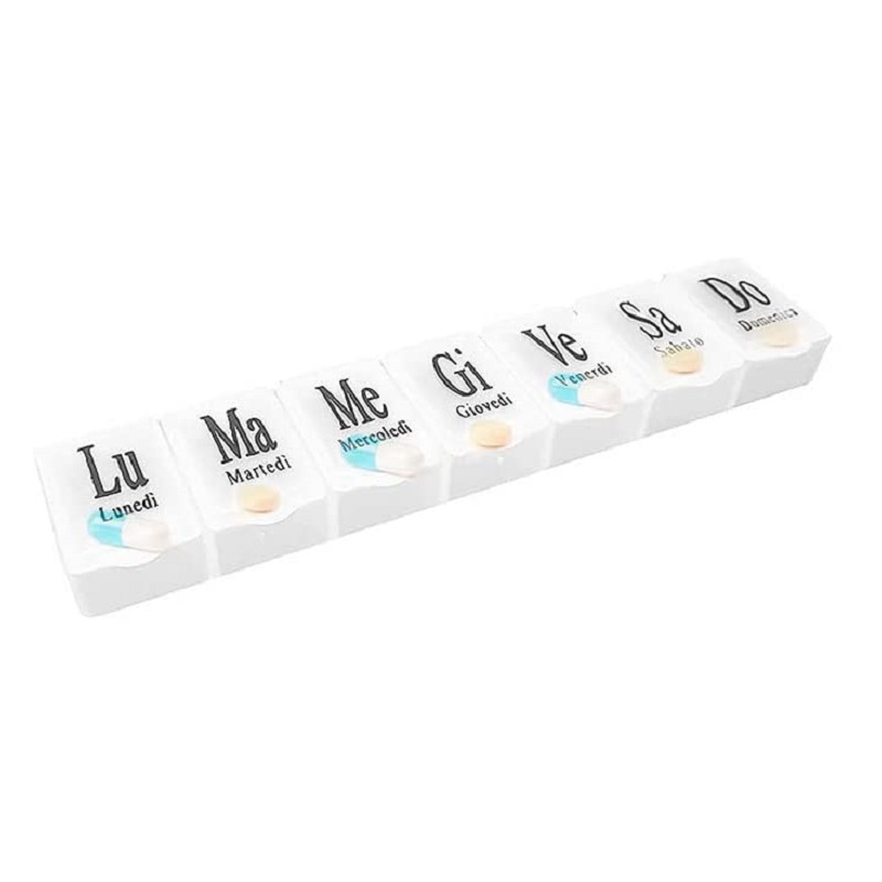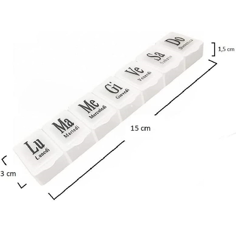 - 7 SCOMPARTI - il portapillole è costituito da 7 scomparti dalla forma quadrata, apribili dall'esterno verso l'interno. C'è scritto il giorno della settimana in ITALIANO su ogni scomparto, leggibile e chiaro così da facilitare l'uso del prodotto.