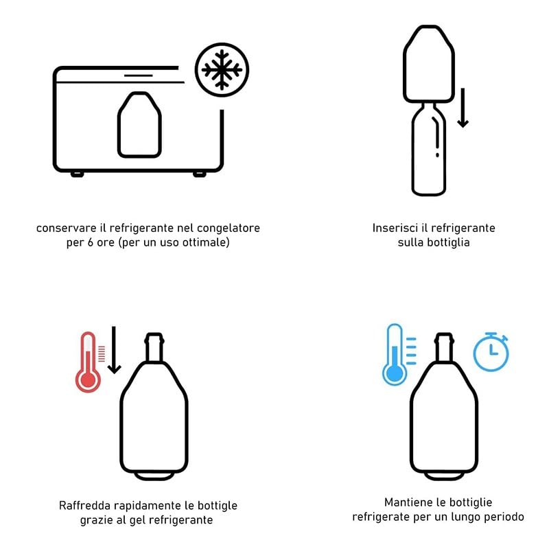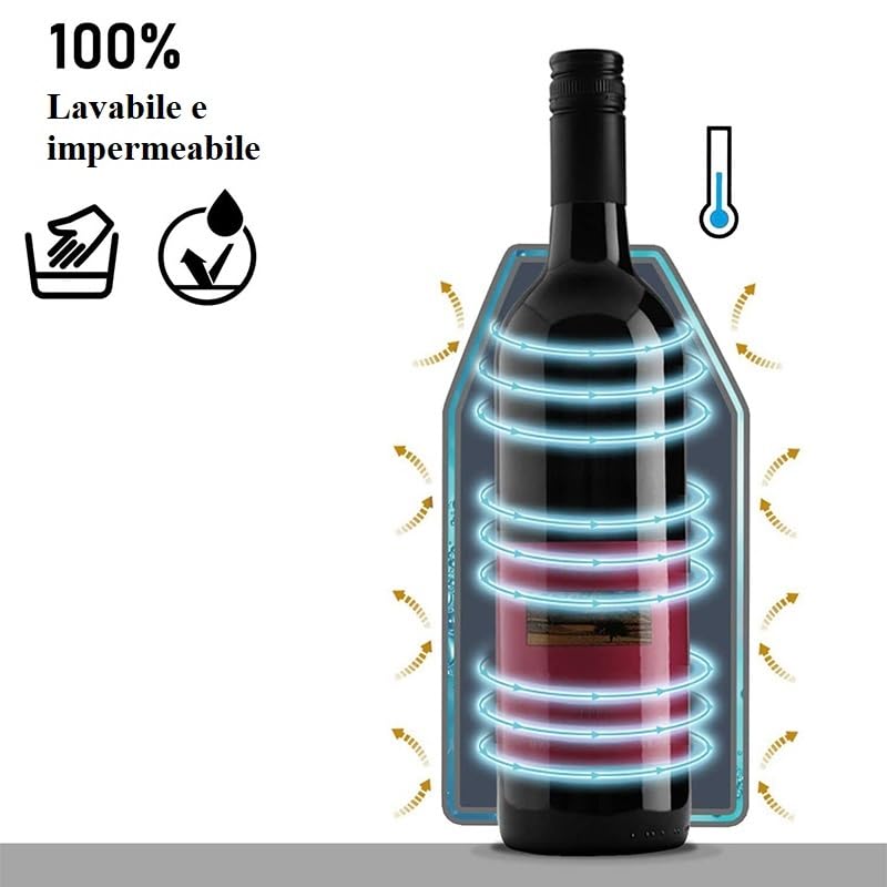 - TOP QUALITY - il prodotto è realizzato in tela di nylon e da gel refrigerante all'interno permettendo così di trattenere il freddo all'interno del refrigeratore e mantenendo la bottiglia di vino o champagne alla temperatura desiderata per un periodo di tempo prolungato. Il refrigeratore isola perfettamente la tua bottiglia e inoltre è impermeabilizzante e facile da lavare.