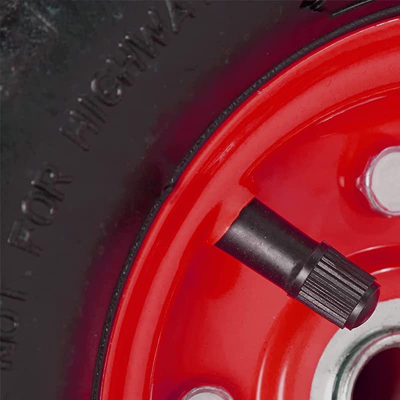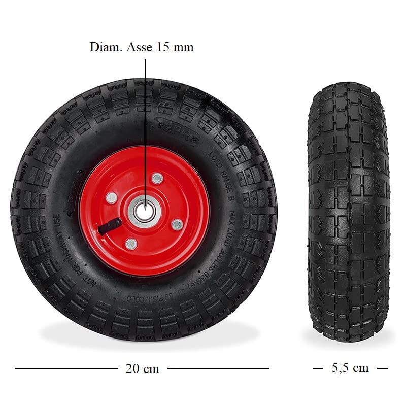 Ruota pneumatica per carrelli di colore Nero e Rosso, con diametro di 21 cm e foro centrale da 20 mm, ideale come ricambio per carrelli o carriola. Ampiamente utilizzata anche per piccoli carrelli elevatori, per piccoli veicoli come mini moto.