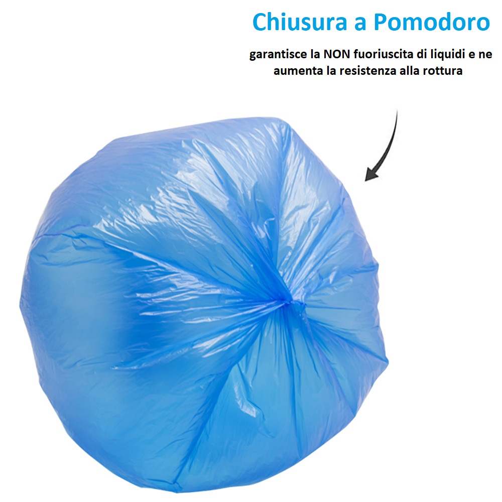 I sacchi per la spazzatura di colore blu o giallo sono estremamente leggeri ma resistenti e possono essere utilizzati con tutti i tipi di rifiuti solidi e liquidi, la dimensione effettiva è di 55x65cm. Prodotto "Made in Italy" sinonimo di qualità dei sacchetti che sono composti al 100% da plastica LPDE. I sacchi sono confezionati in comodi rotoli da 10 sacchetti ciascuno.