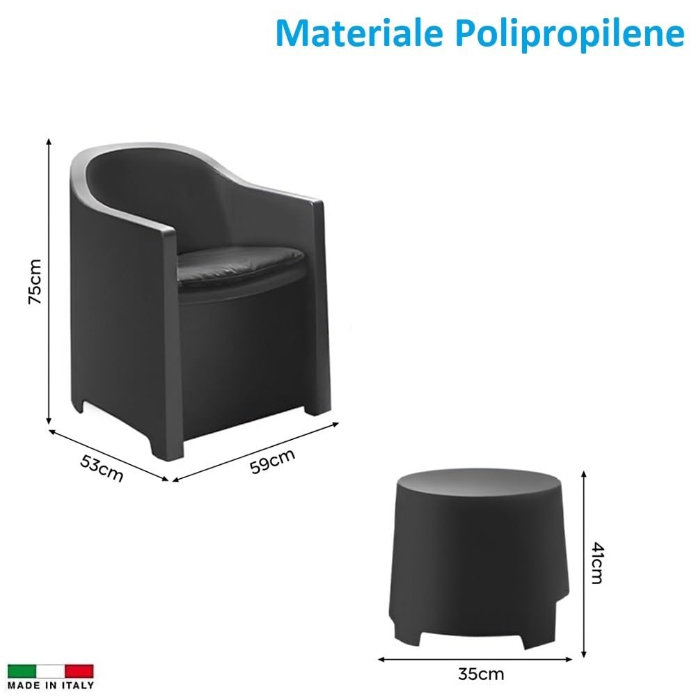 Realizzato in polipropilene, un materiale conosciuto per la sua eccezionale resistenza e durata nel tempo, il Salottino è ideale per affrontare le intemperie quando collocato all’esterno. I cuscini inclusi offrono un ulteriore livello di comodità, permettendo di godere di momenti di relax in totale tranquillità. Inoltre, con la qualità del Made in Italy, questo set rappresenta una scelta elegante e affidabile per ogni ambiente.