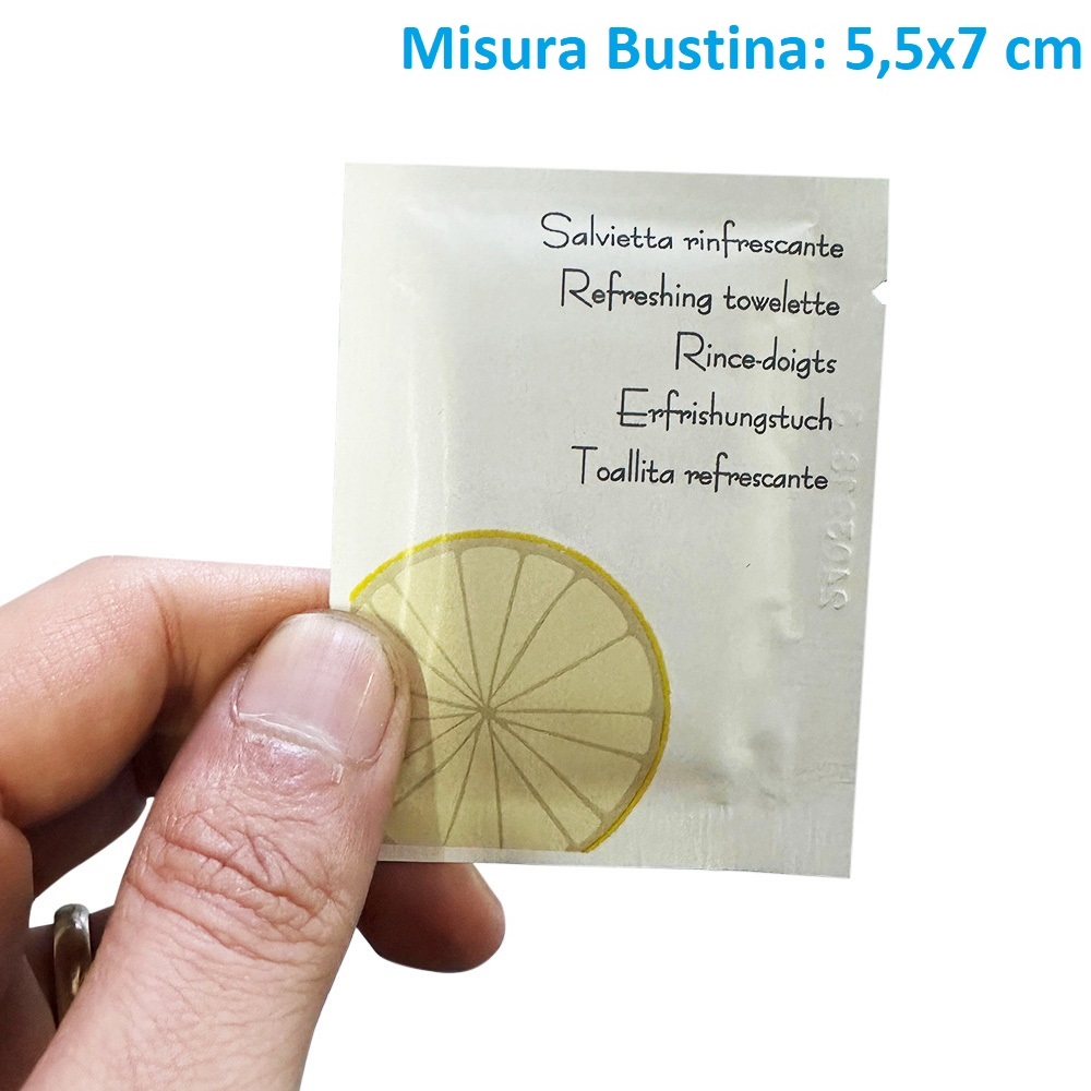 Bustine monouso contenenti salviettine in carta umidificate alla fragranza di limone! La misura della salvietta aperta è pari a 11,5 x 19 cm, ideale soprattutto per eliminare gli odori forti dopo aver mangiato una pietanza a base di pesce.