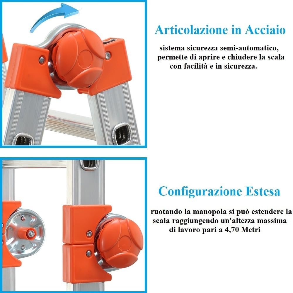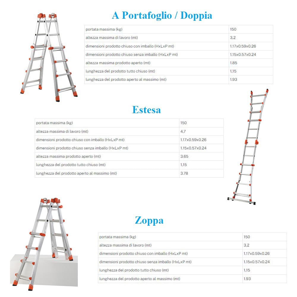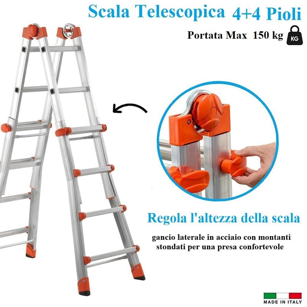 Scala telescopica Peppina in alluminio 4+4 gradini e piedi antiscivolo - Altezza massima di lavoro 4,70 metri, Portata max 150 Kg - 3 configurazioni con snodo in acciaio