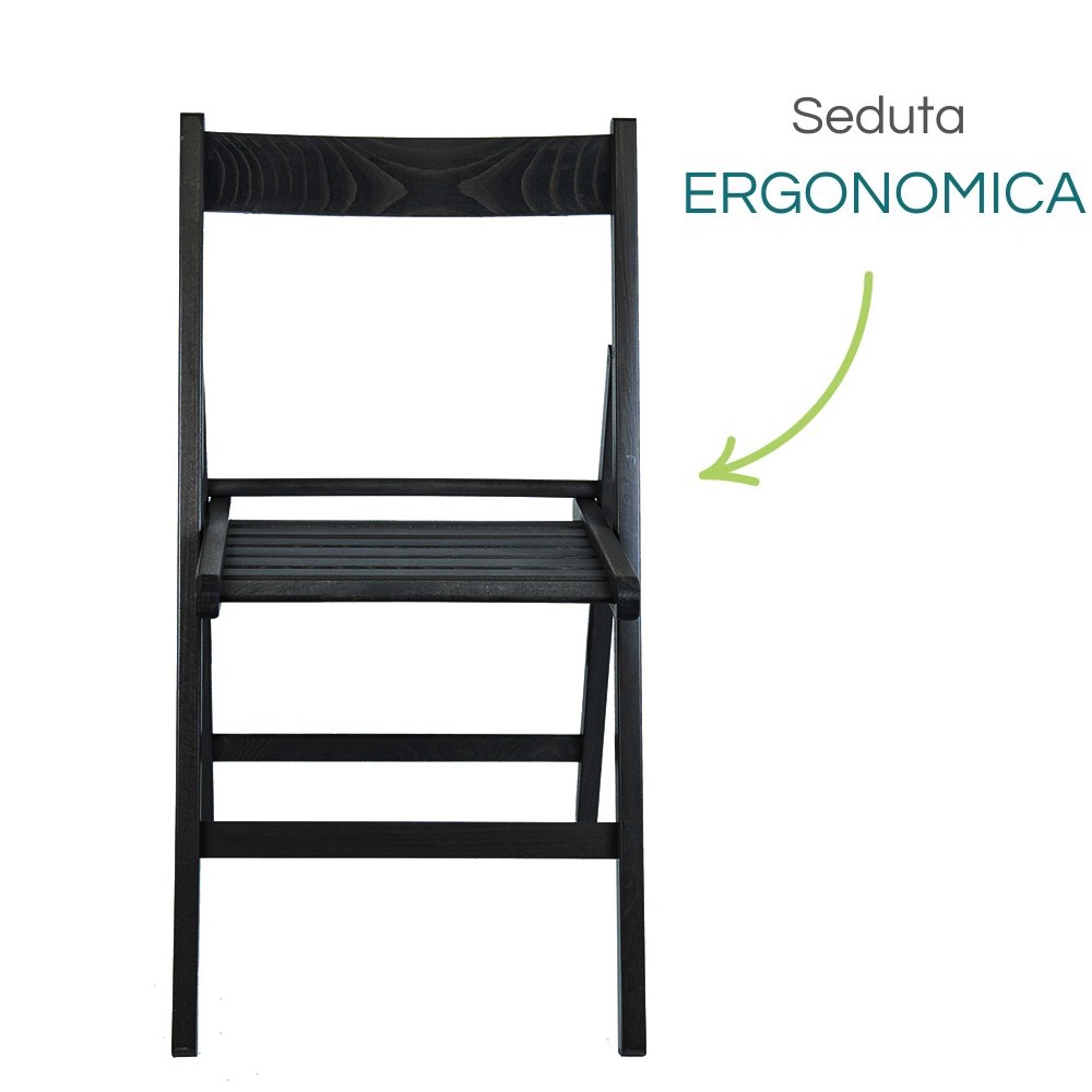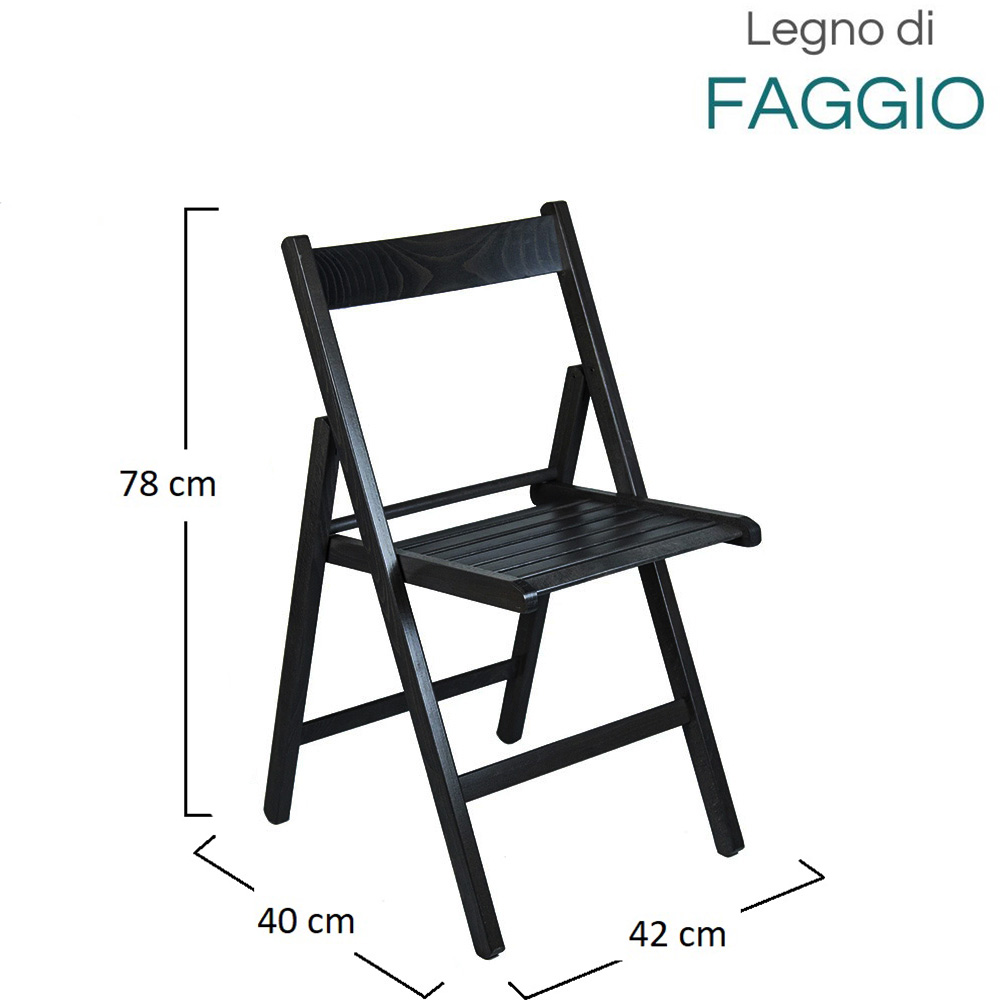 Sedie pieghevoli in legno di faggio di colore Nero, misura pari a 42x40x78 cm, ideali per qualsiasi tipo di evento sia all’interno che all’esterno o semplicemente da utilizzare come sedie ausiliari quando si hanno ospiti a casa.