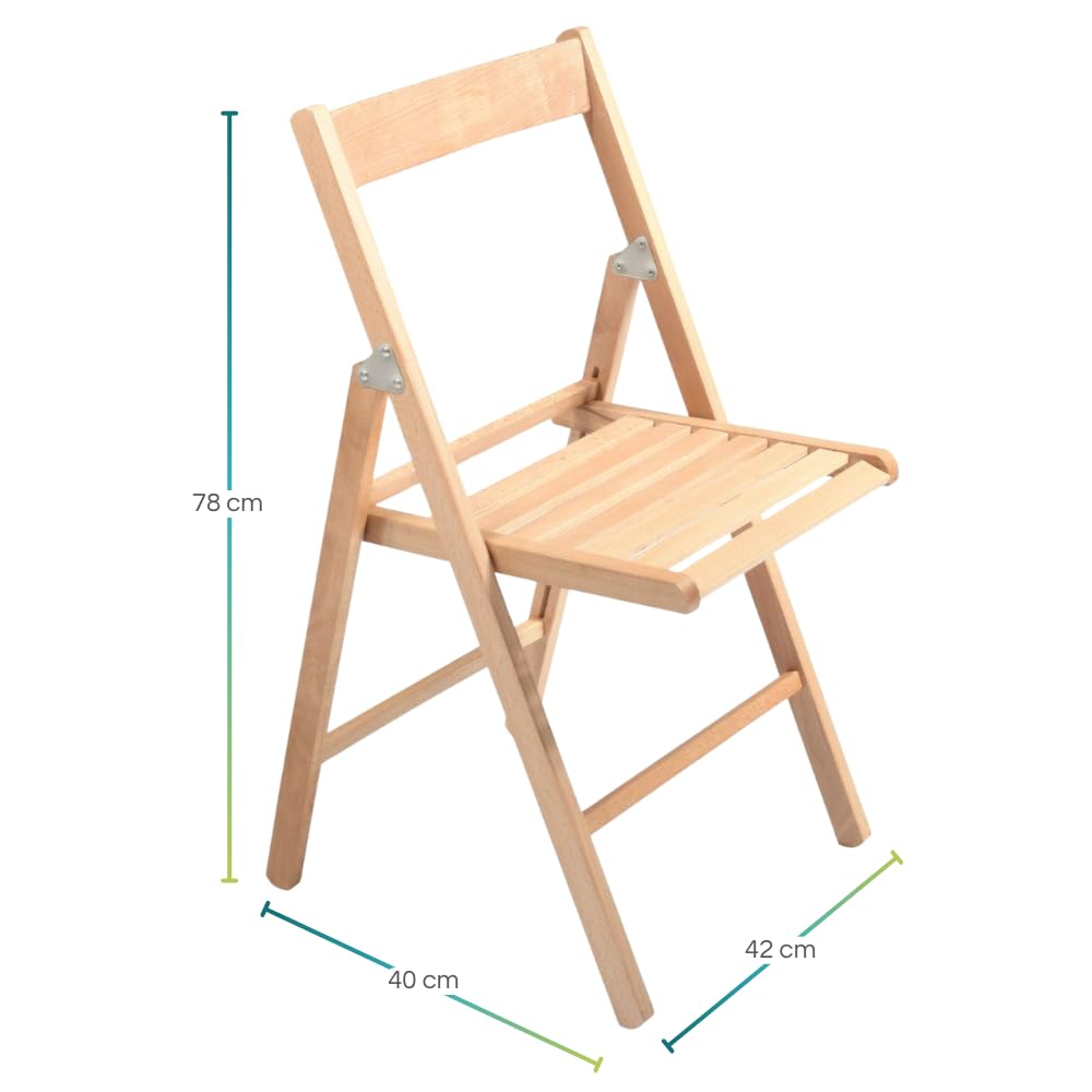 Sedie pieghevoli in legno di faggio di colore Naturale, misura pari a 42x40x78 cm, ideali per qualsiasi tipo di evento sia all’interno che all’esterno o semplicemente da utilizzare come sedie ausiliari quando si hanno ospiti a casa.