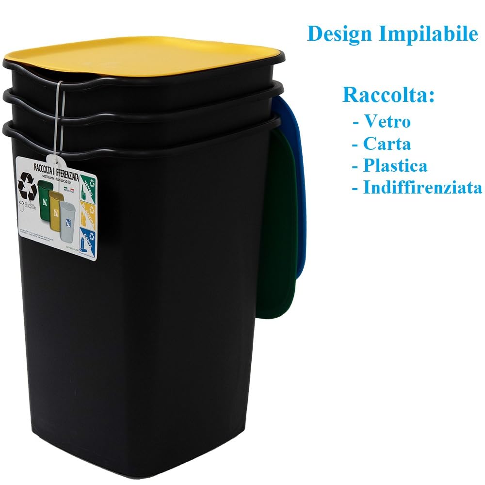 Set da 4 pattumiere per raccolta differenziata da 50 litri - Misura 37,5x36x53,5 cm - Colori Giallo, Verde, Azzurro e Grigio