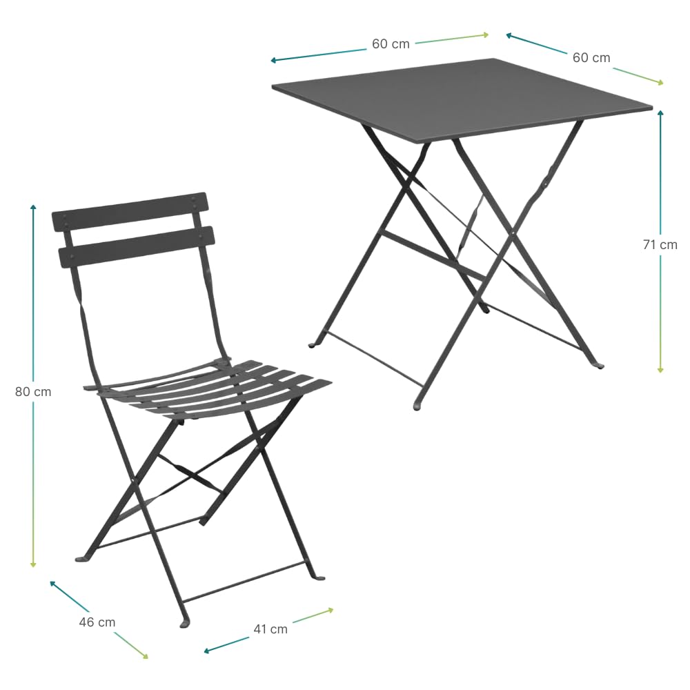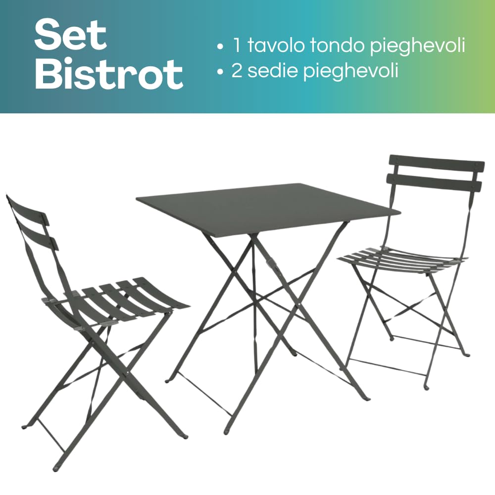 Il "set bistrot quadrato" è la soluzione perfetta per chi cerca un set versatile e resistente da utilizzare sia all'interno che all'esterno della propria abitazione. Composto da 2 sedie e un tavolino pieghevoli, questo set garantisce comfort e praticità grazie alle dimensioni ottimali dei suoi elementi. Le sedie misurano 41x46x80 cm, mentre il tavolino compatto ha dimensioni di 60x60x71 cm, rendendolo adatto anche a spazi ridotti.