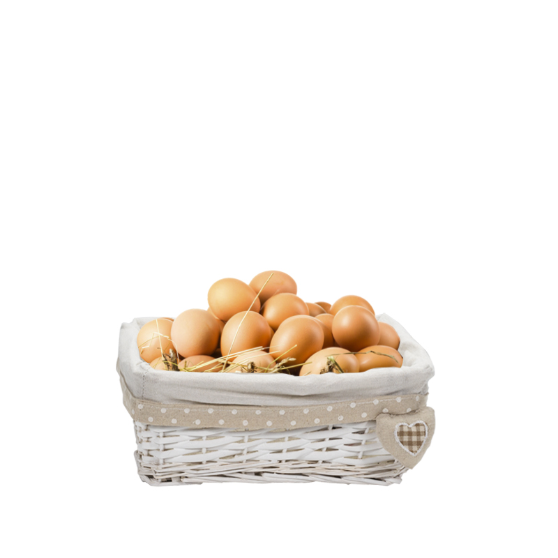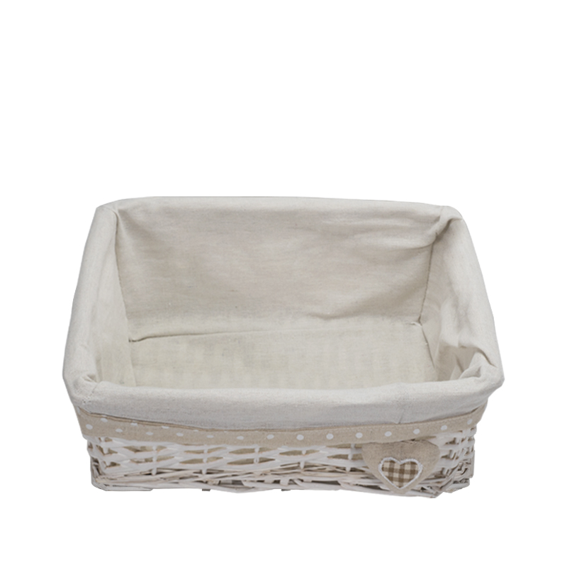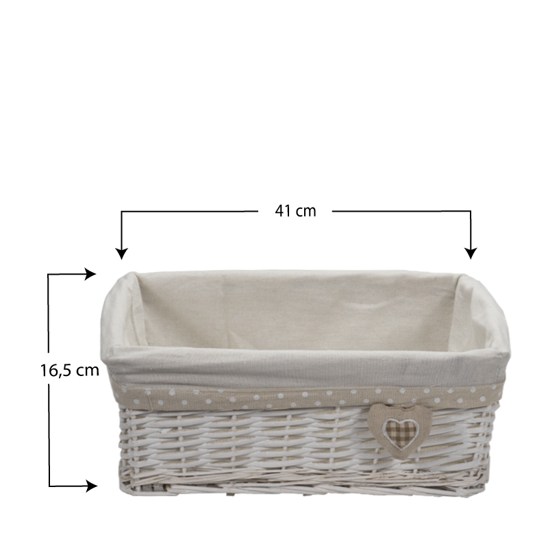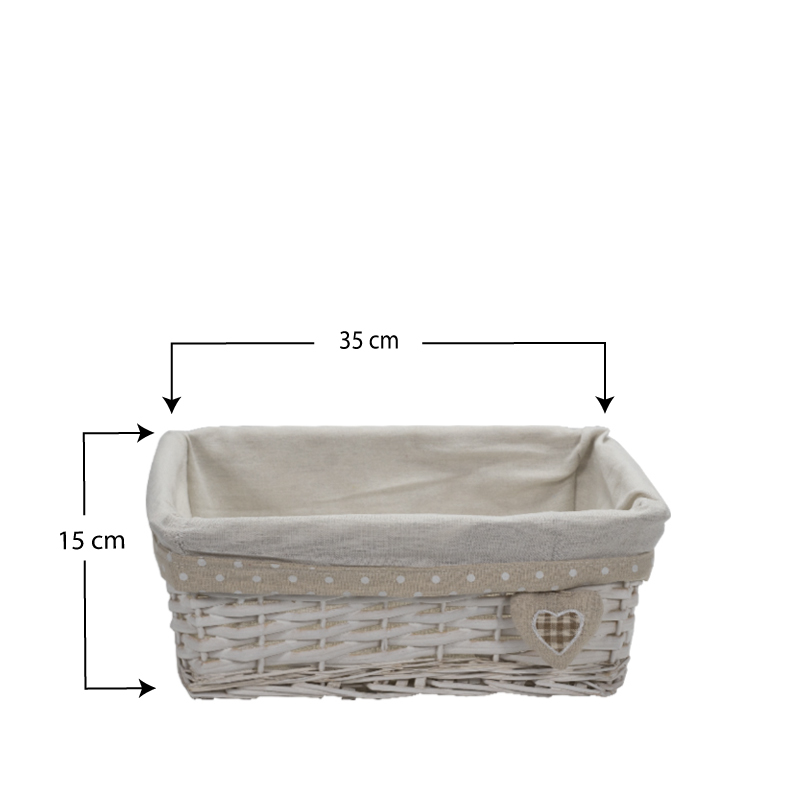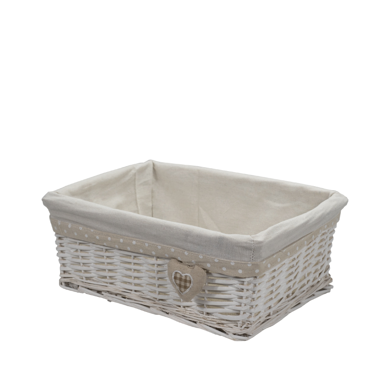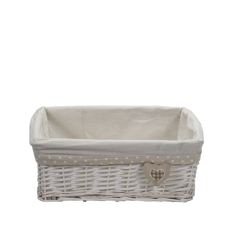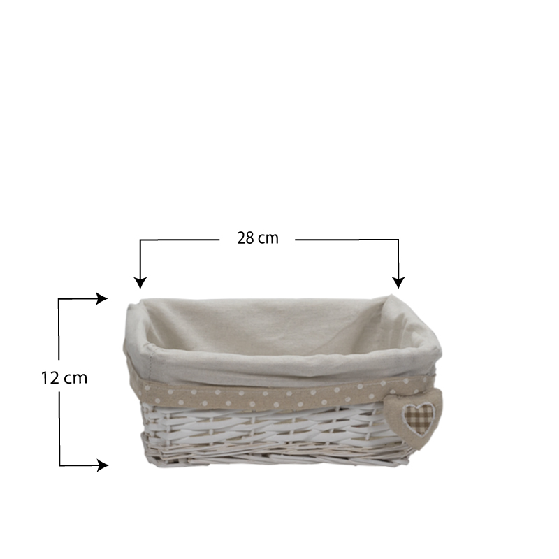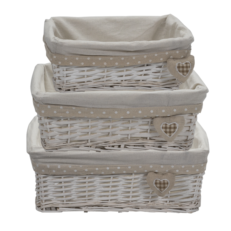Set da 3 Cestini in vimini rettangolari di colore bianco portaoggetti - Misure 30x20x13 cm, 35x25x14 cm, 40x30x15 cm con fodera in tessuto - Bianco con Cuore