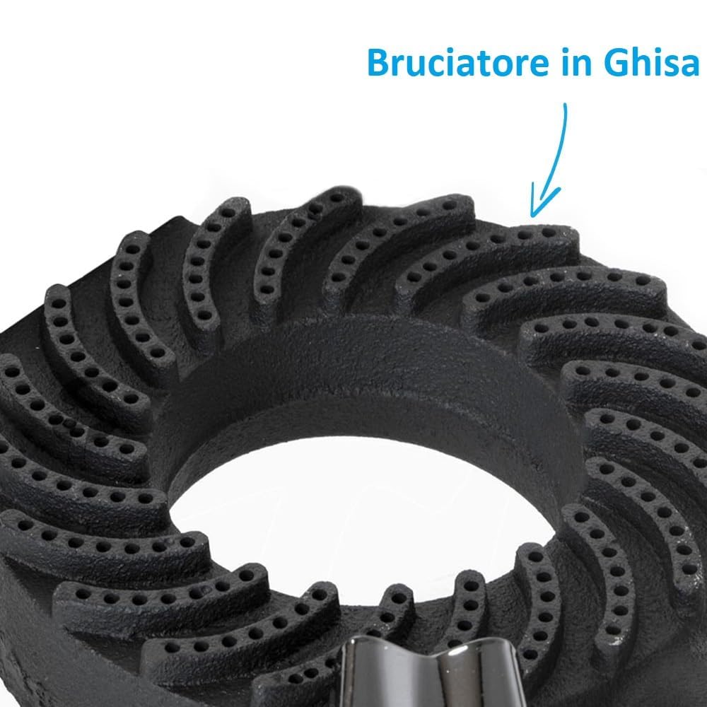 il prodotto va collegato ad una bombola di gas con l'apposito regolatore bassa pressione universale in dotazione così da garantire un'alimentazione continua ed efficiente. L'alimentazione a gas assicura una combustione pulita e sicura. Il fornellone è omologato secondo la normativa CE2016/426 Gar 2018, garantendo i più alti standard di sicurezza e affidabilità.