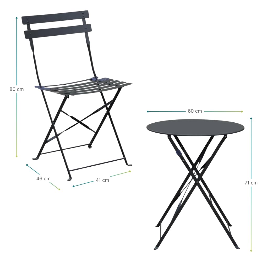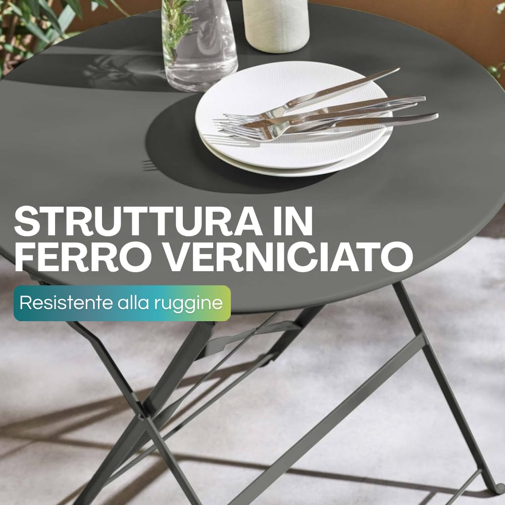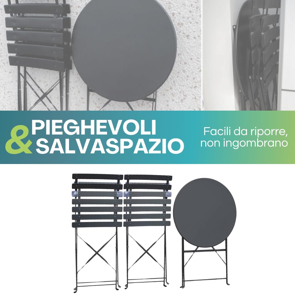 Il "set bistrot tondo" è la soluzione perfetta per chi cerca un set versatile e resistente da utilizzare sia all'interno che all'esterno della propria abitazione. Composto da 2 sedie e un tavolino pieghevoli, questo set garantisce comfort e praticità grazie alle dimensioni ottimali dei suoi elementi. Le sedie misurano 41x46x80 cm, mentre il tavolino compatto ha dimensioni di 60x71 cm, rendendolo adatto anche a spazi ridotti.