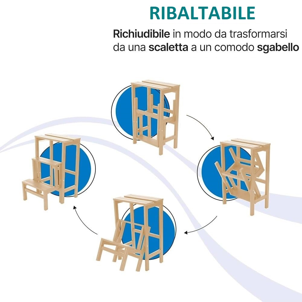 Scala sgabello con Ribalta a 3 Gradini in Legno di Faggio - Sgabello pieghevole Salvaspazio con Gradini Antiscivolo - Misura 36x44x58 cm