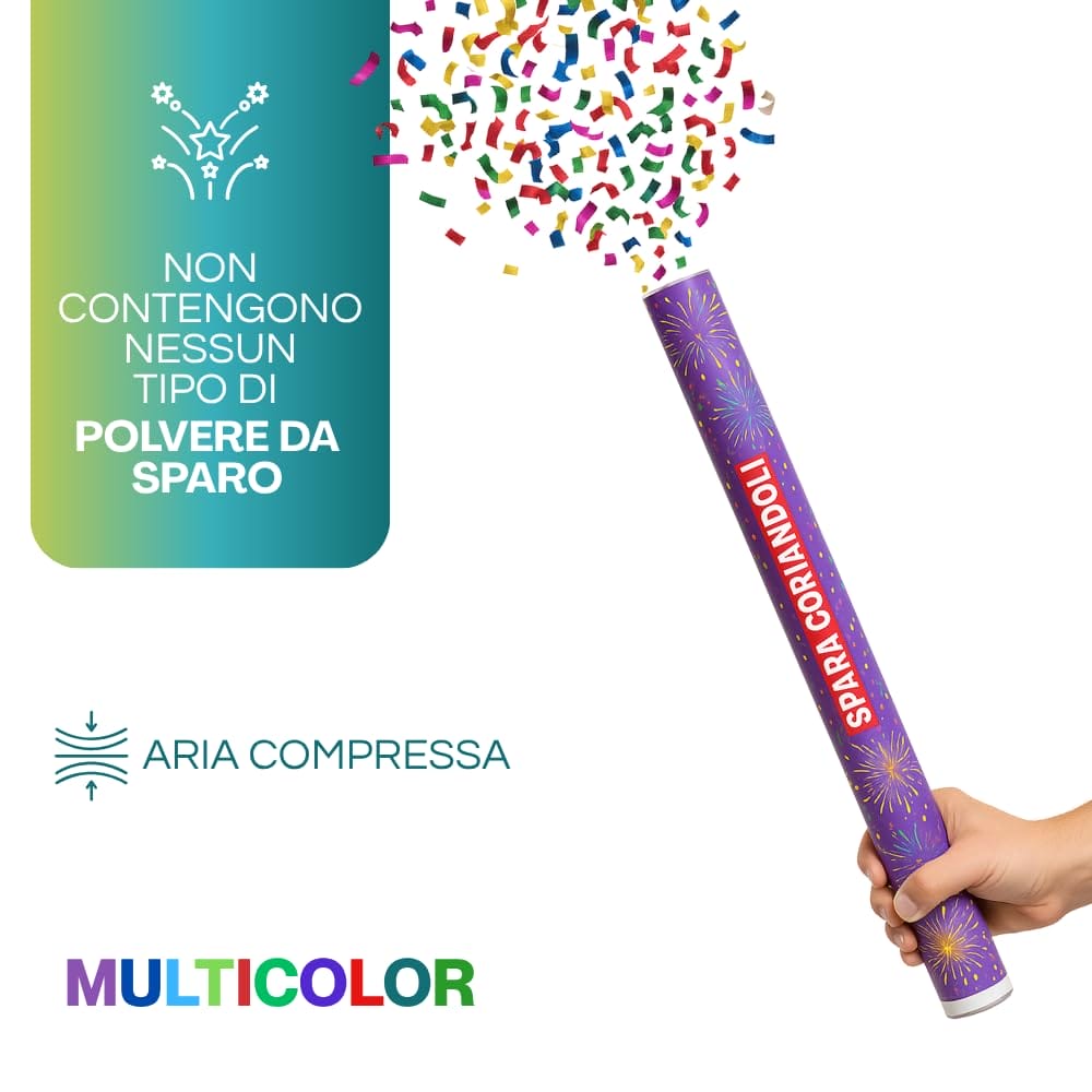 Spara Coriandoli multicolore da 60,5 cm di lunghezza con diametro di 5 cm. Coriandoli di vari colori indispensabili per creare un bellissimo effetto scenografico durante le tue feste: matrimonio, battesimo, cresima, comunione, ecc.