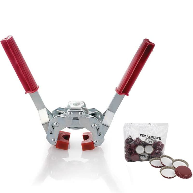 KIT: Tappatrice a due leve per tappi a corona - Capsulatrice per bottiglie con guarnizione in nylon + 100 tappi a corona da 26 mm