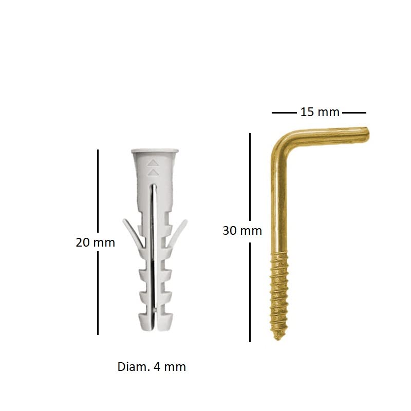 10 Tasselli con 10 ganci color Oro mis. 4x20 mm. Tassello a muro in Nylon 5371 con gancio in acciaio Tasselli universali per fissaggio quadri, cornici, specchi e scaffali