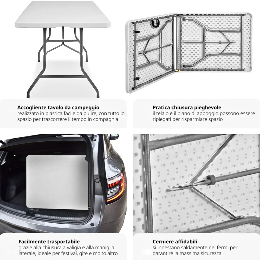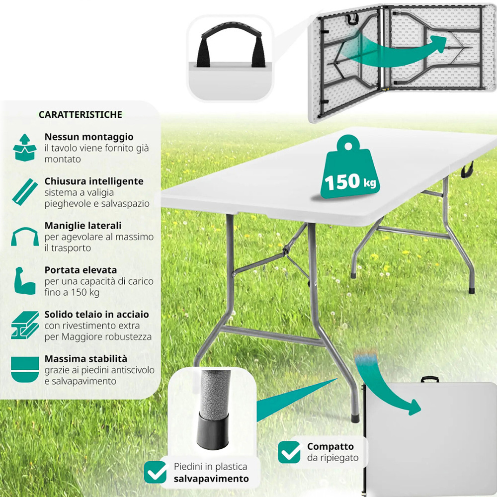 Tavolo catering rettangolare in plastica pieghevole a valigia - 180X71X74 cm - Struttura in resina resistente, ideale per l'esterno, giardino e campeggio - Bianco