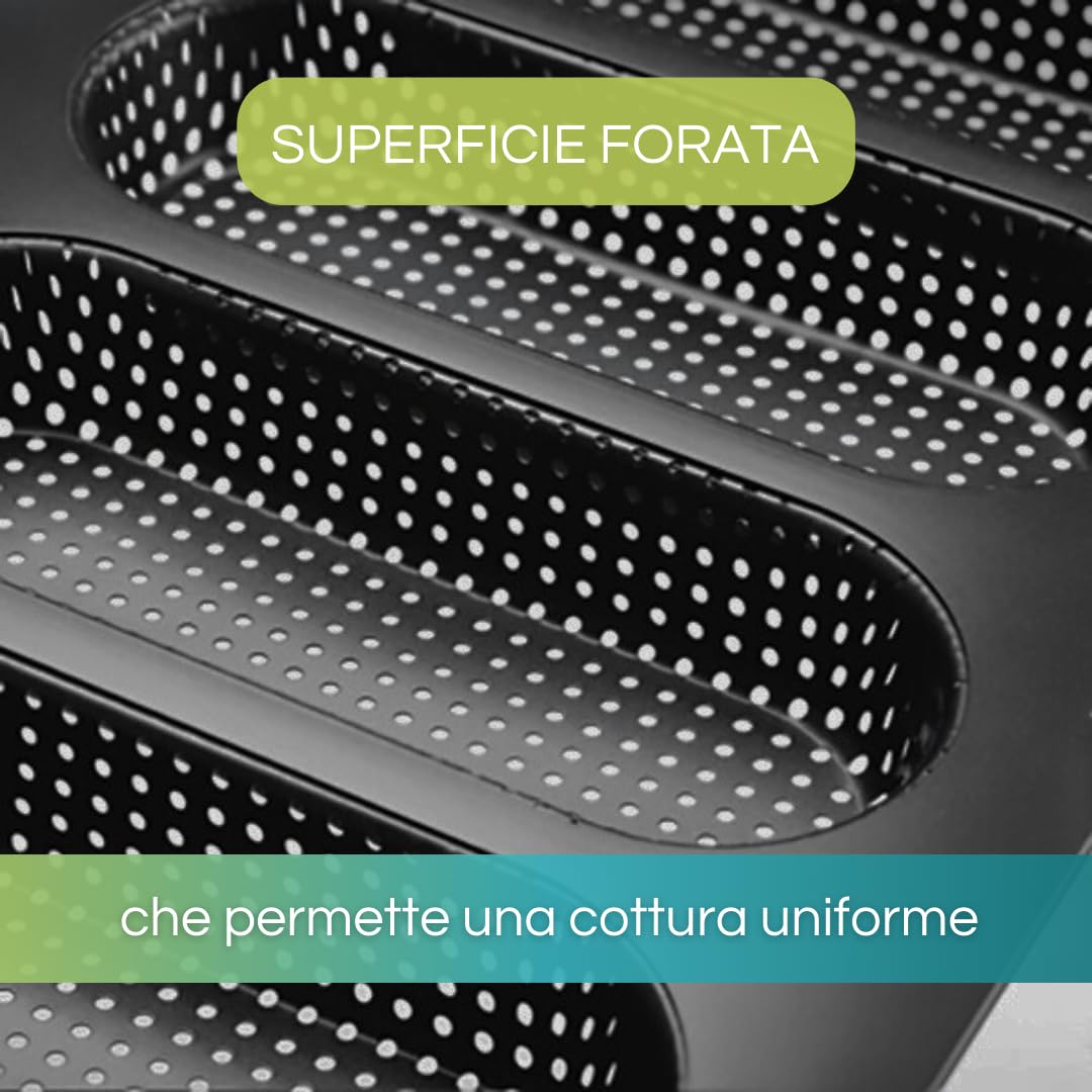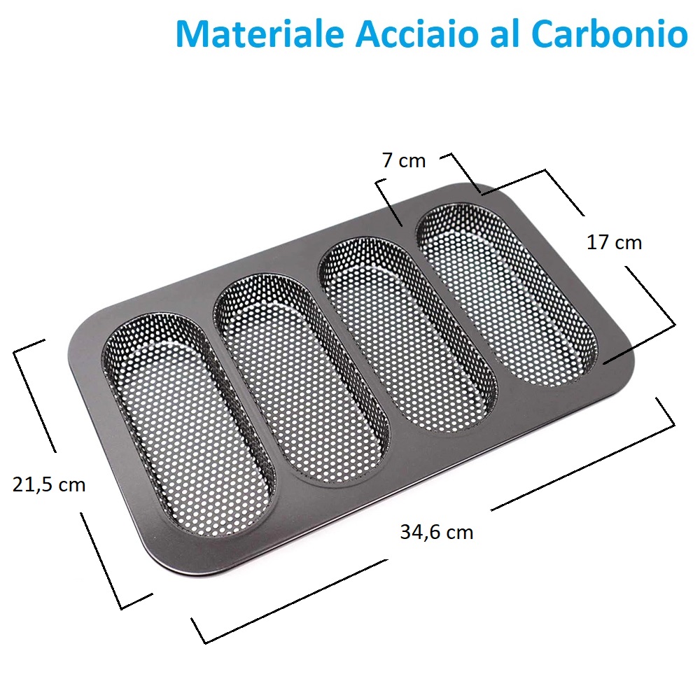 Teglia da forno antiaderente per panini e baguette in acciaio al carbonio - Misura 34,6x21,5 cm - 4 Stampi forati da 7x17 cm - Resistente fino a 230°